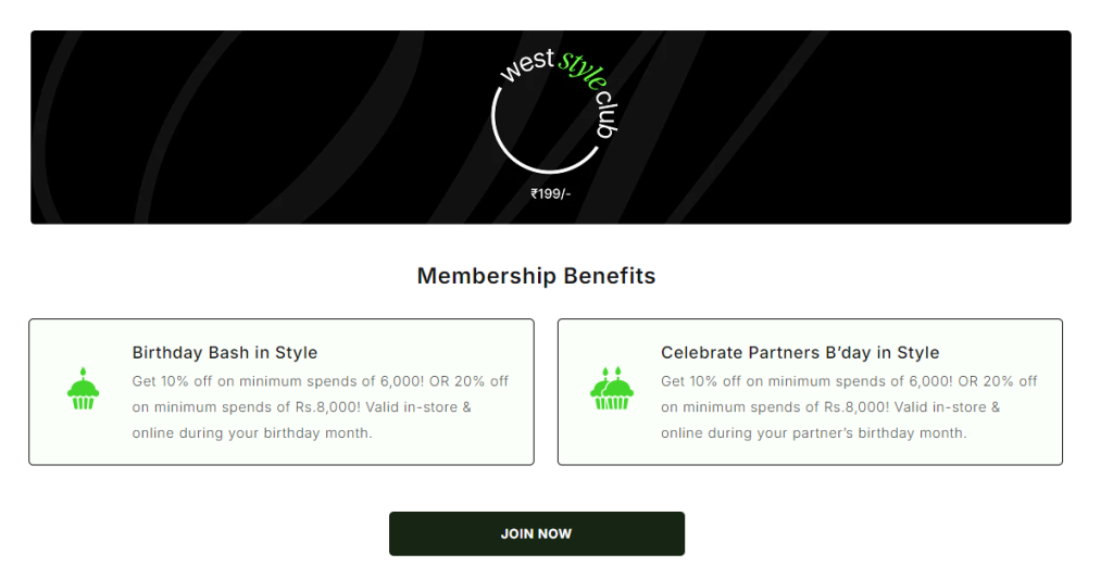 The current terms are: For WestStyleClubmembers: Earn rate: Rs.1000 = 1 point; Burn rate: 1 point = Re1 Points can be redeemed at Westside stores with a minimum points balance of 150 points.