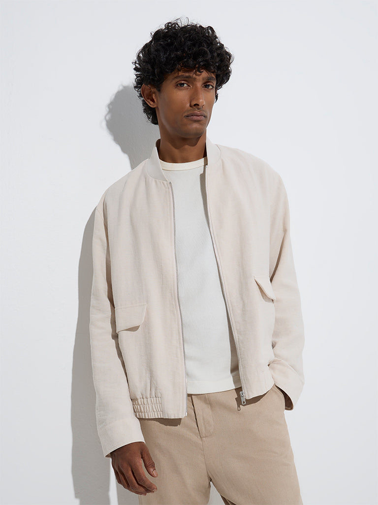 Cut in a relaxed silhouette. this beige bomber jacket from Ascot is made from a linen-blend fabric for a lightweight feel. Designed with a mock collar. full sleeves. and a zipper placket. it’s the perfect layer for transitional weather. Two flap pockets add a functional touch to this stylish piece.