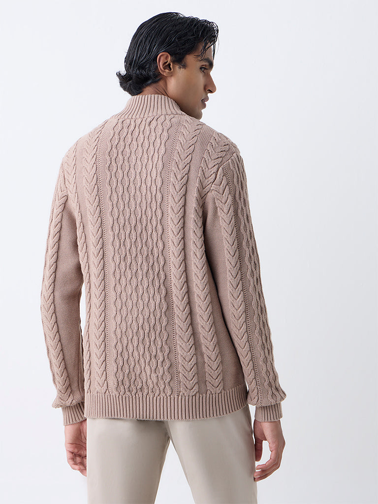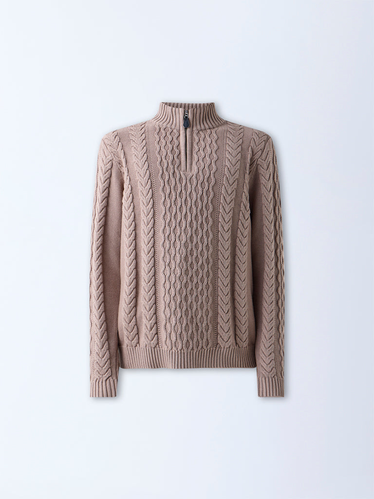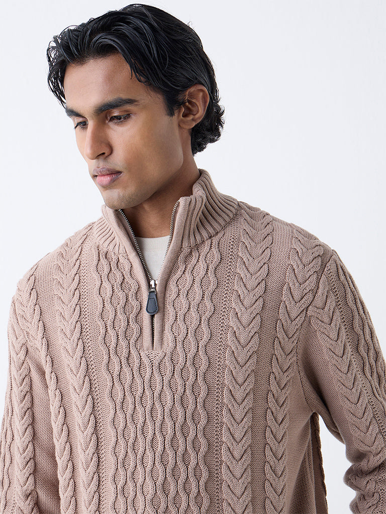 Ascot launches this beige sweater crafted from pure cotton with a cable-knit pattern that delivers softness and depth to the design. Designed with a high neck. a short zipper closure. and full sleeves. it balances function with clean style. A polished winter staple. it offers warmth and sophistication for effortless everyday layering.