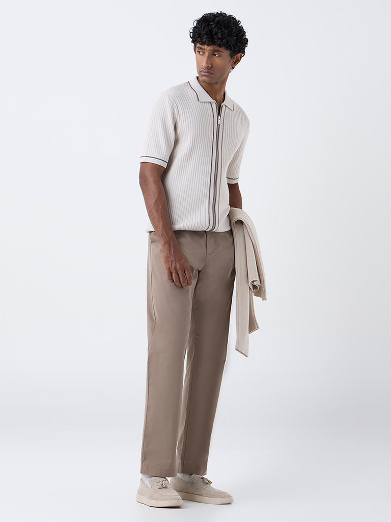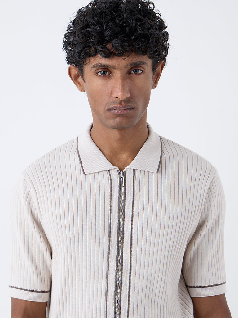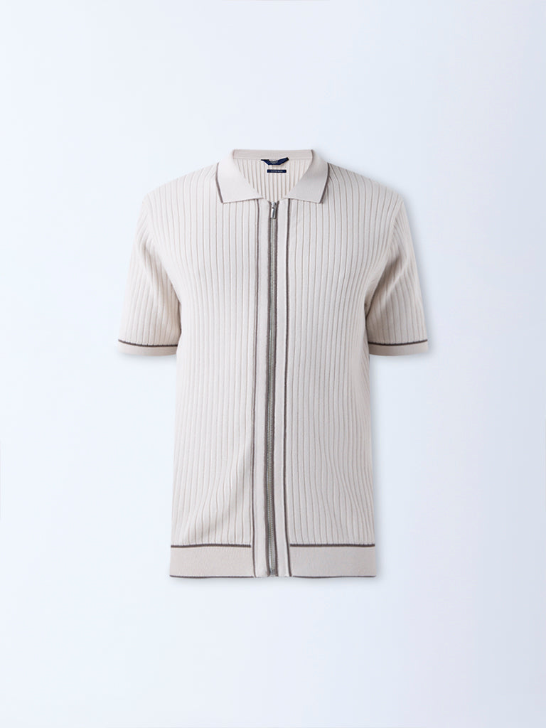 Ascot introduces this beige t-shirt. tailored from a luxurious-blend fabric with a self-striped texture. Framed in a relaxed shape. it features a spread collar. zipper front and short sleeves. The design blends polish with an easy-going attitude for everyday refinement.
