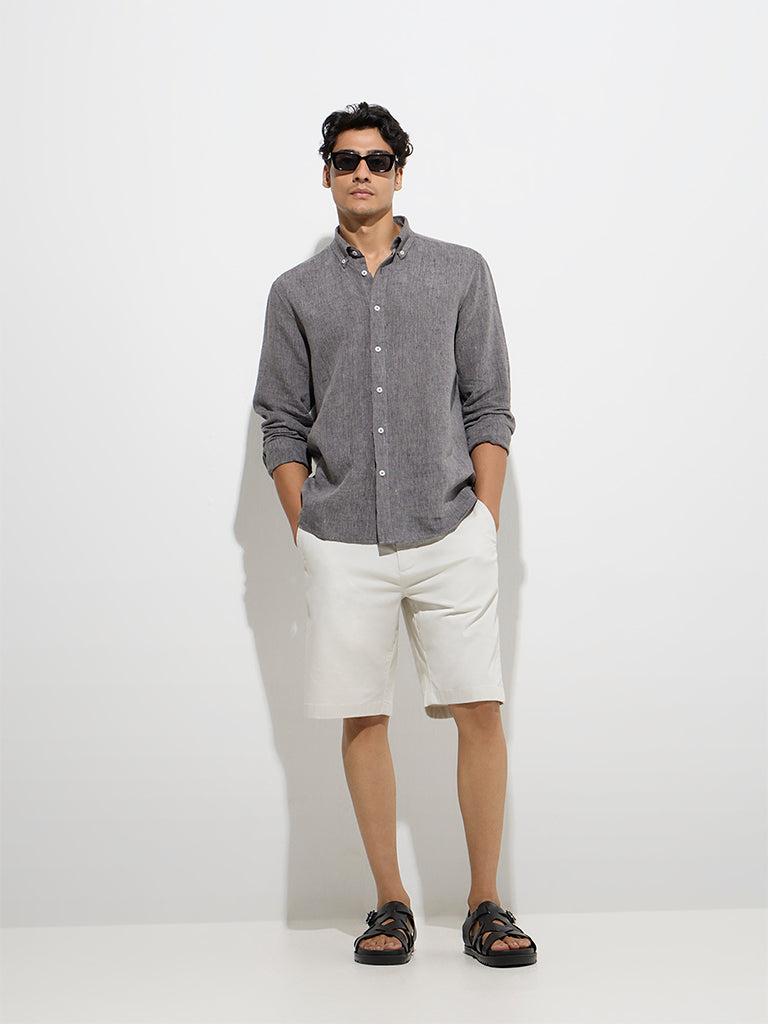 This charcoal shirt from Ascot channels laid-back sophistication with its pure linen construction and textural melange finish. The relaxed silhouette offers ease without compromising on structure. framed by a sharp button-down collar and full sleeves with buttoned cuffs.