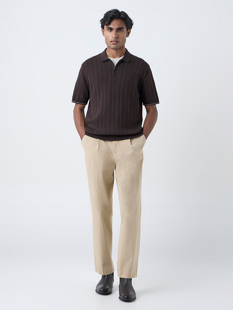 Ascot presents this dark brown polo t-shirt. defined by itself-striped texture over a premium-blend fabric. The relaxed frame. spread collar. zipper front and short sleeves combine comfort with structure. Designed for ease and polish. it complements both tailored and off-duty pairings effortlessly.
