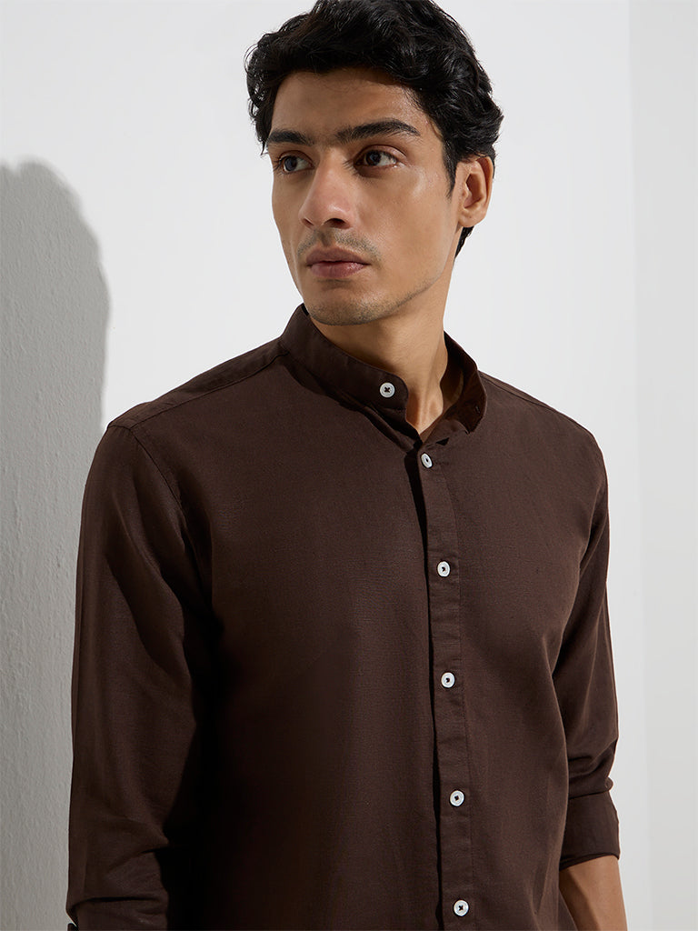 This dark brown shirt from Ascot is constructed from a sumptuous linen-blend fabric that offers elevated comfort and a naturally textured feel. Cut in a relaxed silhouette. it features a mandarin collar. full sleeves. and a button-up front for ease of wear.