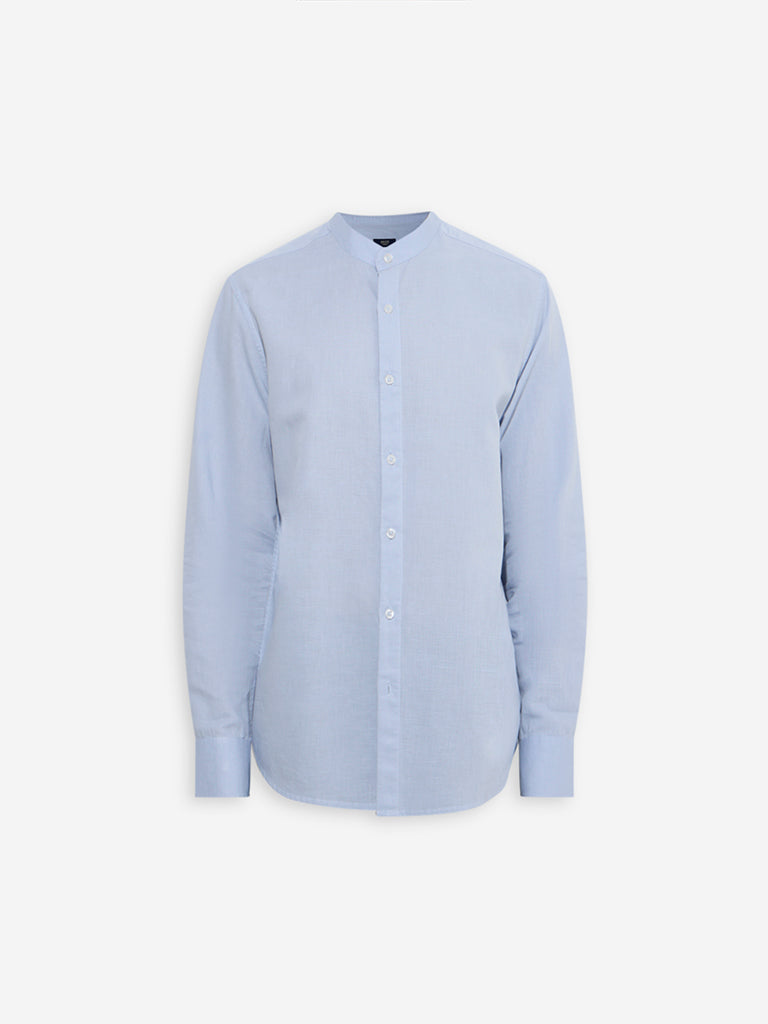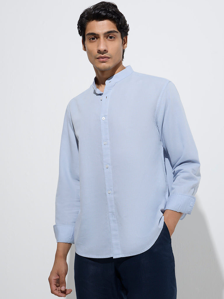 This light blue shirt from Ascot is constructed from a premium linen-blend fabric and tailored in a relaxed silhouette. It features full sleeves. a button-up front. and a neat mandarin collar. making it a stylish piece that adds a dapper touch to your casual wardrobe.