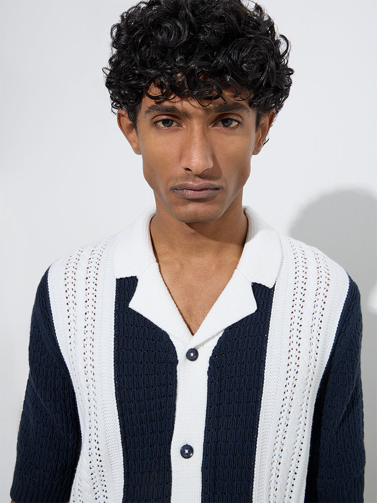 Ascot Navy Colour-Blocked Knitted Relaxed-Fit Cotton Shirt