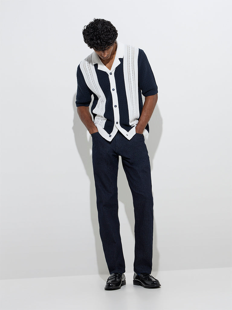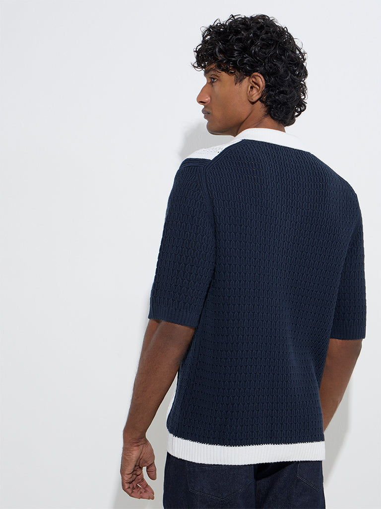 Ascot presents this navy shirt woven from a knit-textured fabric. Featuring a colour blocked profile. its relaxed silhouette ensures enhanced comfort. The winter wear is designed with a notched collar that extends to a button-up front and half sleeves.