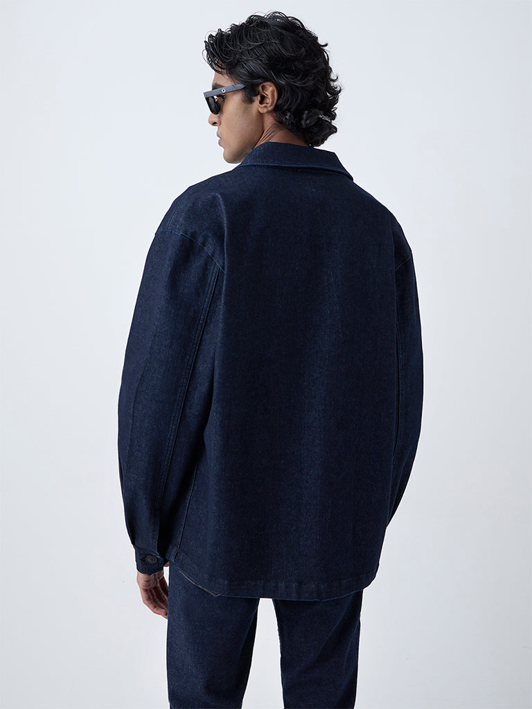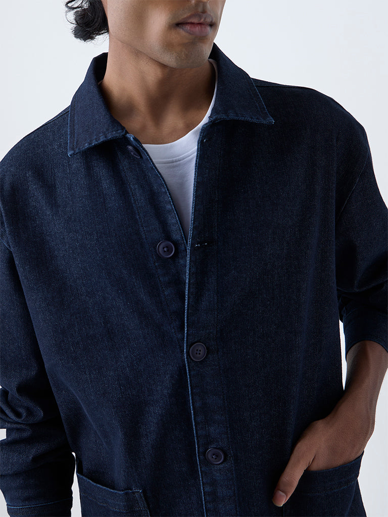 This navy denim shacket from Ascot elevates casual dressing with its relaxed frame and refined detailing. Crafted from a premium cotton-rich fabric. it offers the perfect balance of structure and comfort. A sharp collar. button placket. and full sleeves define its profile. while dual front pockets bring together utility and sophistication.