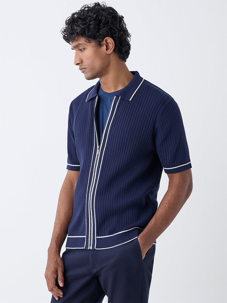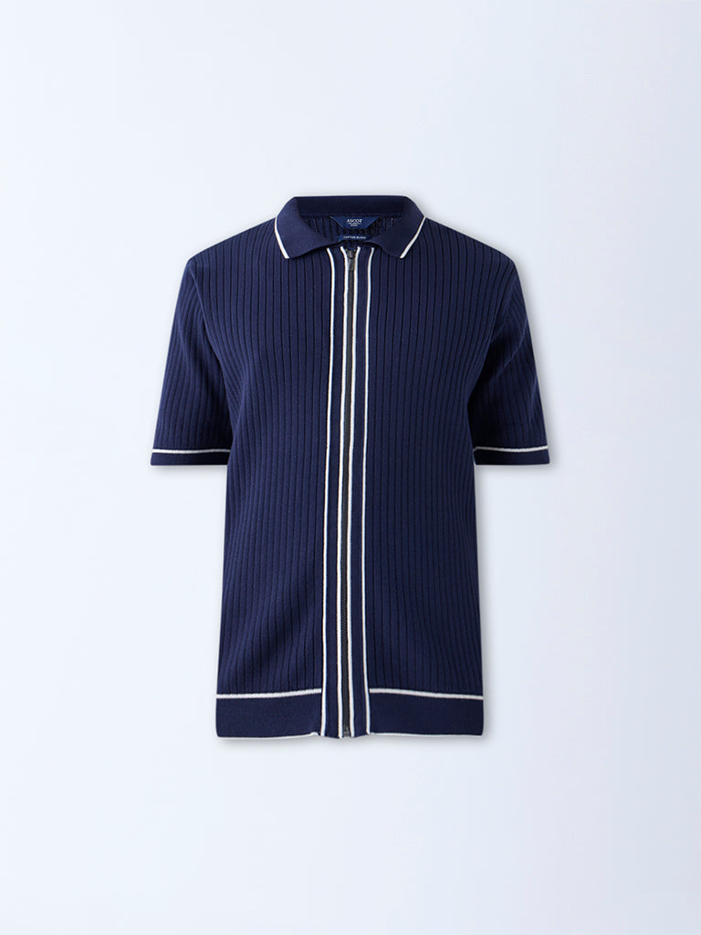Refine your casual lineup with this navy t-shirt from Ascot. Designed with a spread collar and full zip placket. it’s tailored from a soft cotton-blend fabric in a relaxed fit. White stripe accents at the collar. cuffs and zip lend a sporty yet sophisticated edge.