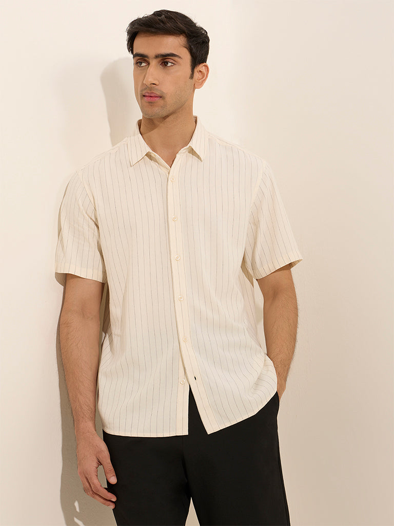 Ascot introduces this off-white shirt adorned with pinstriped patterns. Crafted from a blended-linen fabric in a relaxed profile for optimal comfort. it includes a classic collar that extends to a buttoned placket and half sleeves.