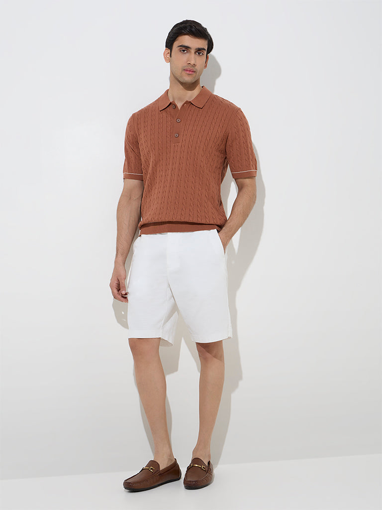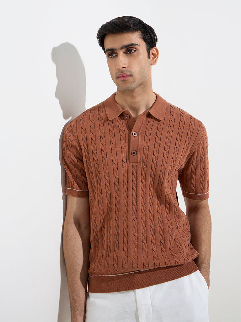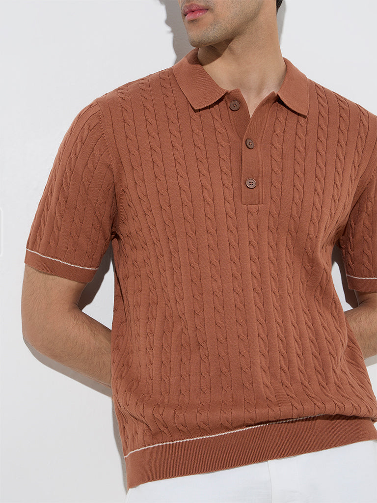 This rust polo t-shirt from Ascot showcases a cable-knit pattern for a textured finish. Crafted from a cotton-blend for sumptuous comfort. the relaxed-fit separate features a spread collar with a brief buttoned placket and half sleeves for effortless style.