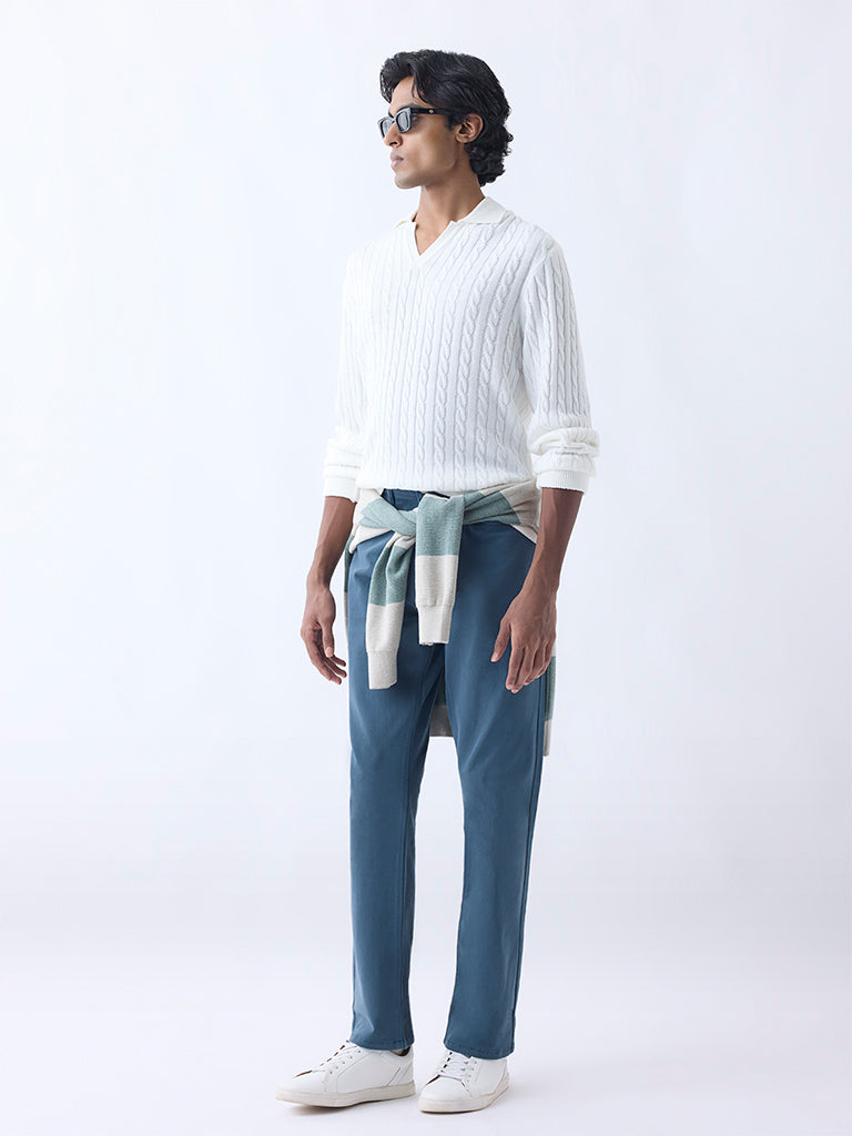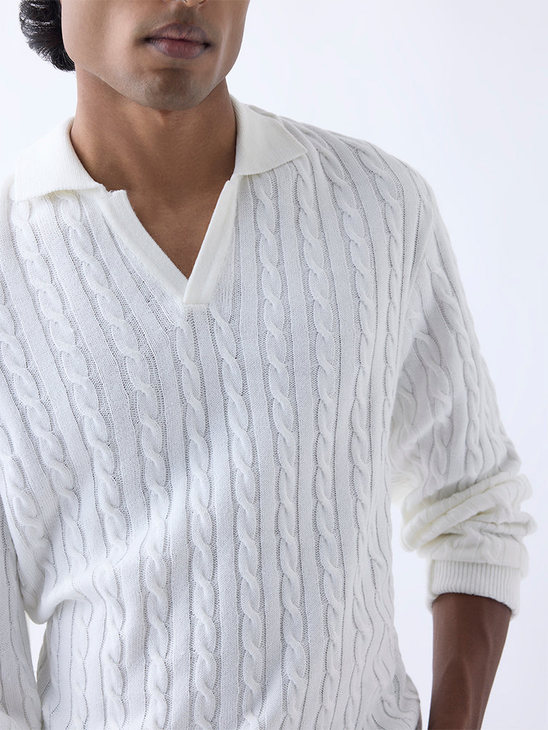 Ascot introduces this white sweater built in a relaxed frame from luxurious-blend fabric. Showcasing a cable-knit texture. it is framed with a polo neck and full sleeves. making it an easy essential for refined casual wear.