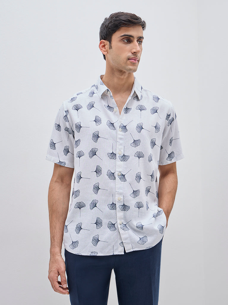 White shirt from Ascot defined with floral patterns. Milled from a lightweight fabric in a relaxed handle. it features a spread collar that extends to a button placket and half sleeves.