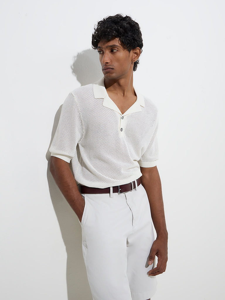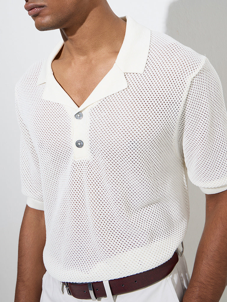 Ascot introduces this white t-shirt. crafted from a knitted fabric for superior breathability. Designed with a sleek camp collar and a two-button placket. the relaxed-fit garment is finished with half sleeves.