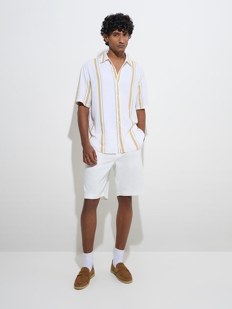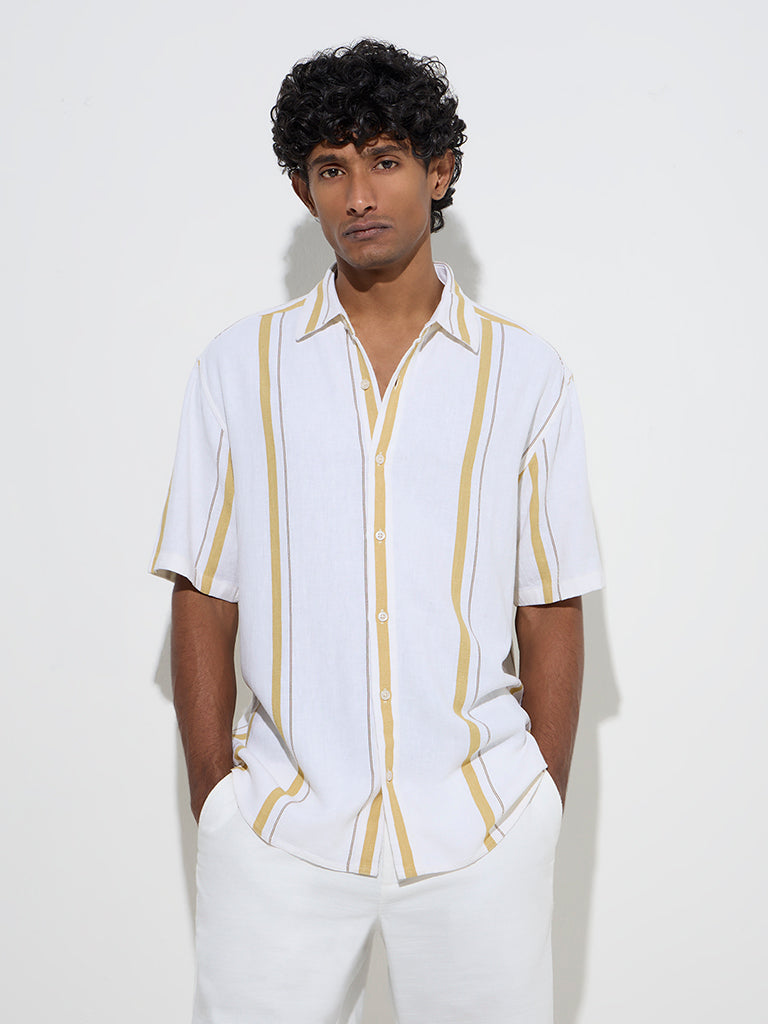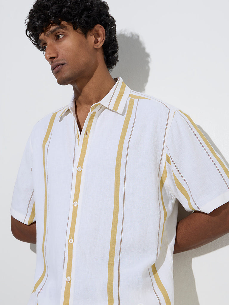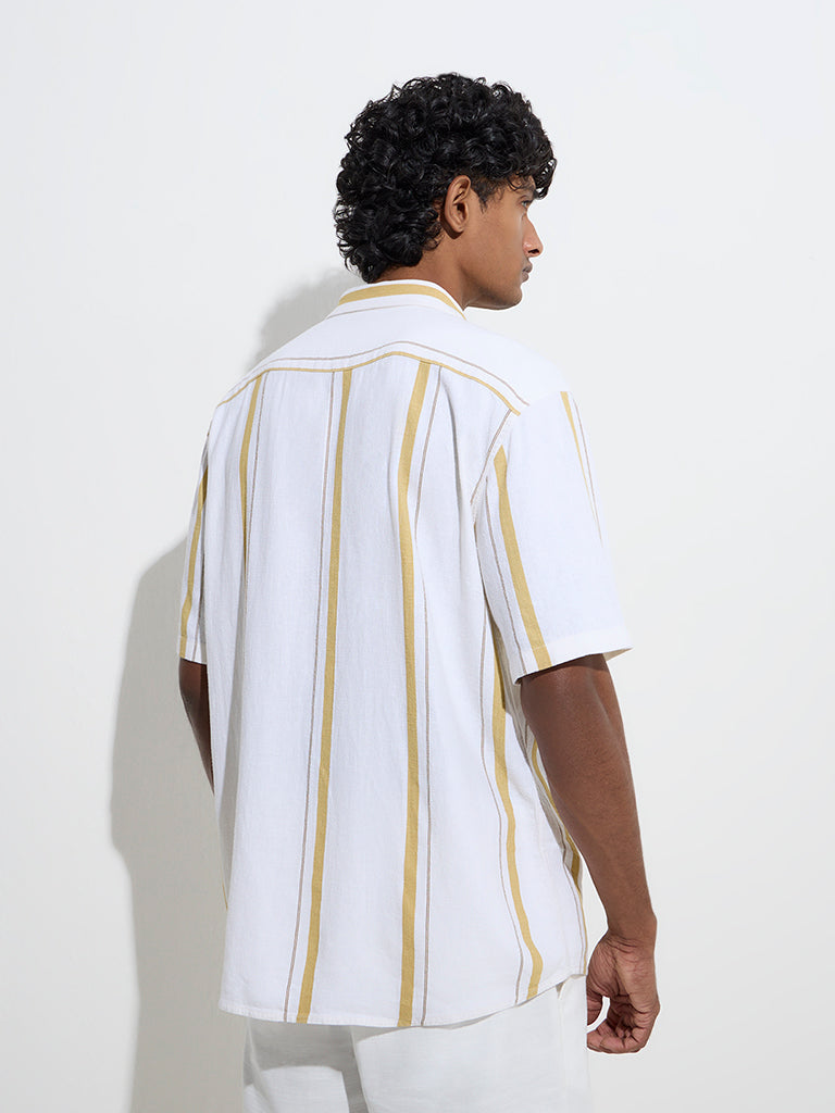 Ascot launches this white shirt fashioned with striking stripes. Milled from a sumptuous linen-blend fabric. the relaxed-fit garment includes a spread collar that extends to a button placket and half sleeves.