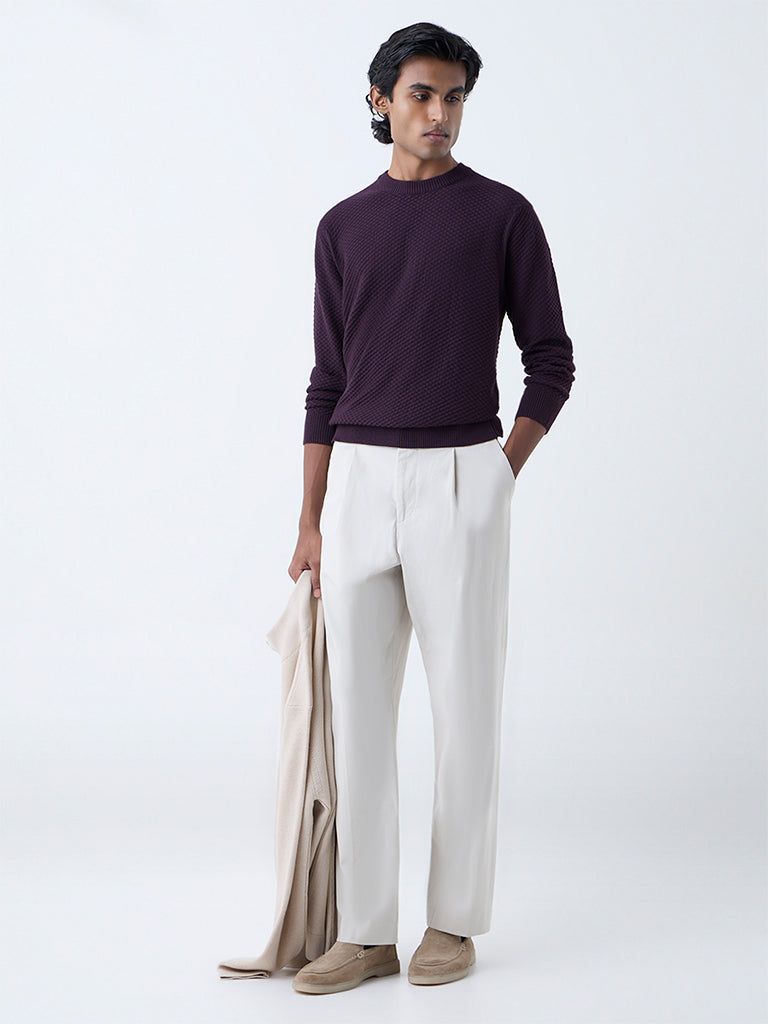 In a bold wine shade. this sweater from Ascot embodies modern sophistication. The cotton-blend knit offers a soft drape and textured handle. while the relaxed silhouette. crew neckline. and full sleeves strike a balance between ease and polish. Designed for the gentleman who favours quiet confidence over excess.