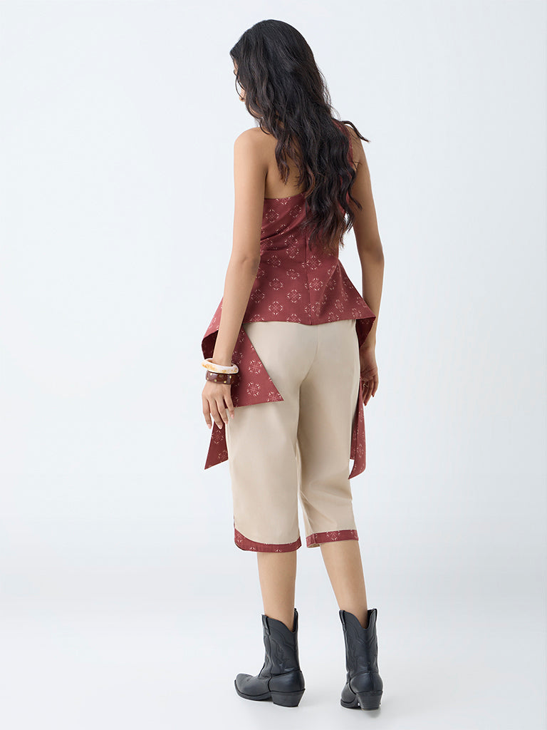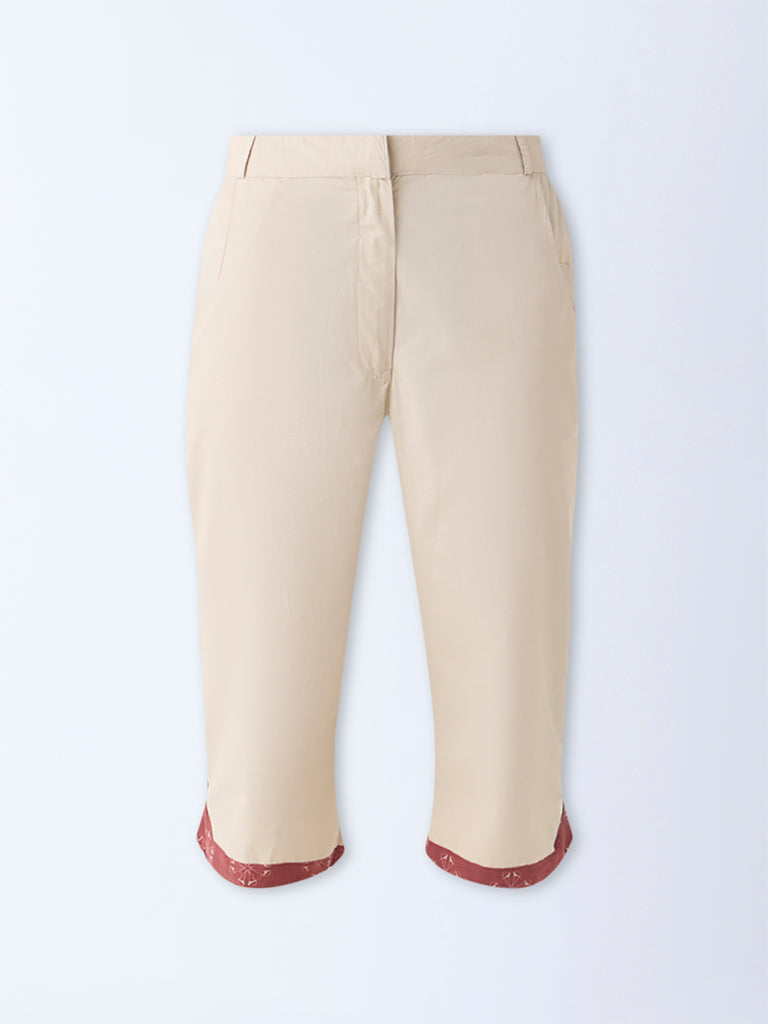 These beige capris from Westside’s Young New Gamechanger initiative are designed by Manvi G. an emerging talent from NIFT Bengaluru. Inspired by The Navagunjara – blending mystical symbolism with modern artistry. The capris seamlessly blend modern wearability with subtle cultural influences. Expertly tailored from pure cotton. they feature an elegant silhouette with a secure buttoned waistband. belt loops. and side pockets for practical everyday comfort. Distinctive patterned cuffs at the hem add a sophisticated. contemporary accent to this versatile design.