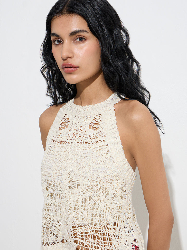 Bombay Paisley brings you this beige top designed with crochet craftsmanship. Made from quality fabric. it boasts a crew neck and a sleeveless cut.