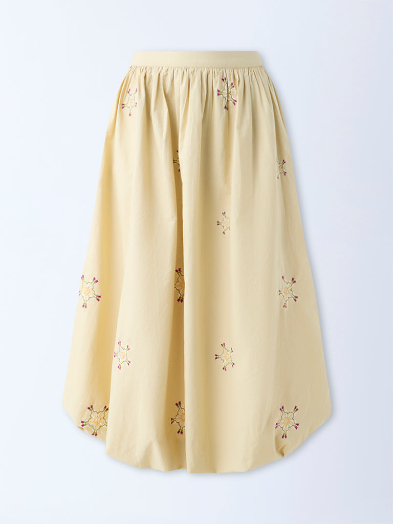 This beige skirt from Westside’s Young New Gamechanger initiative is designed by Manvi G. a rising talent from NIFT Bengaluru. Inspired by The Navagunjara – blending mystical symbolism with modern artistry. The skirt artfully combines cultural elegance with modern functionality. Crafted from a cotton-blend fabric. it showcases delicate floral embroidery across a voluminous bubble silhouette. complemented by an elasticated waistband and practical side pockets for easy everyday wear.
