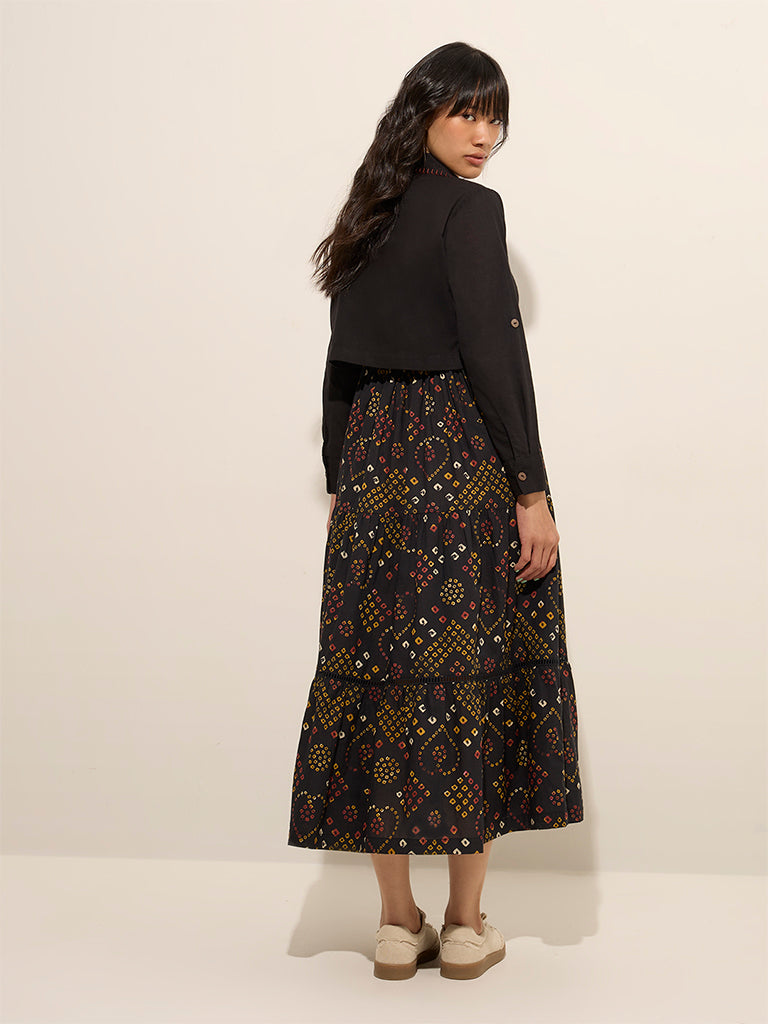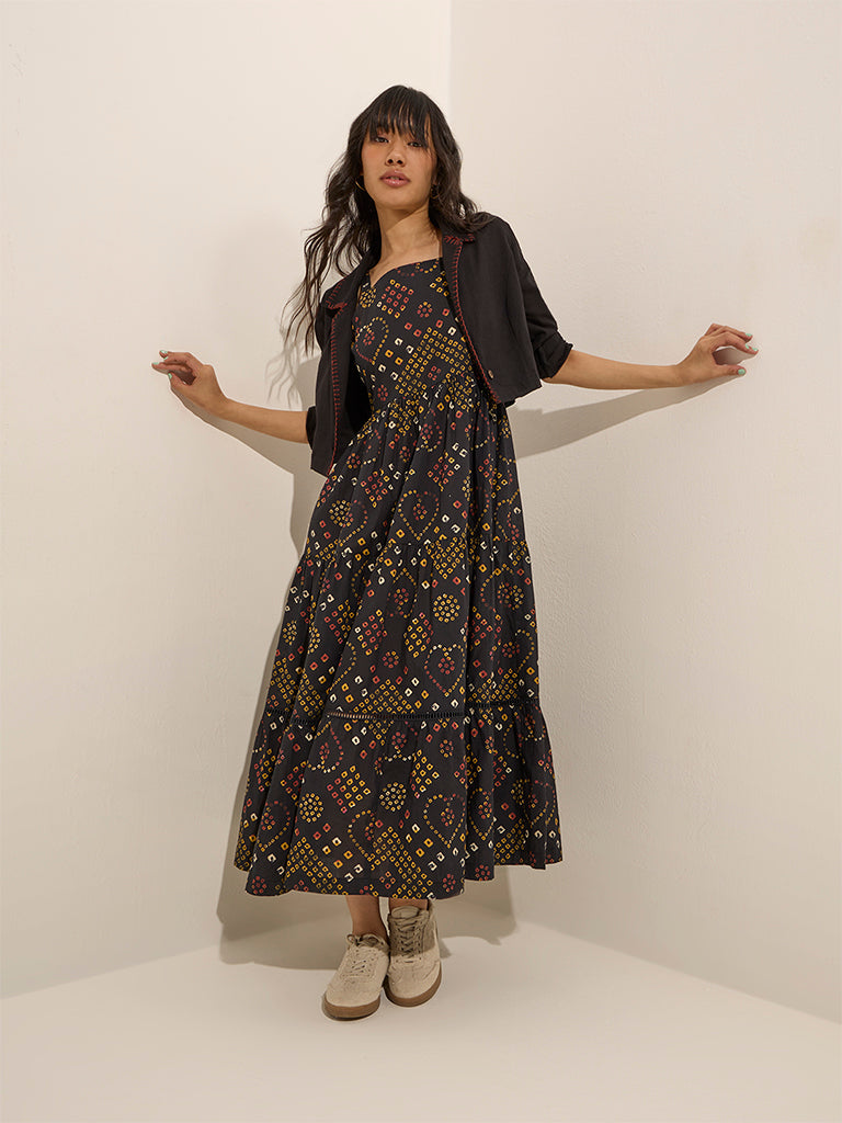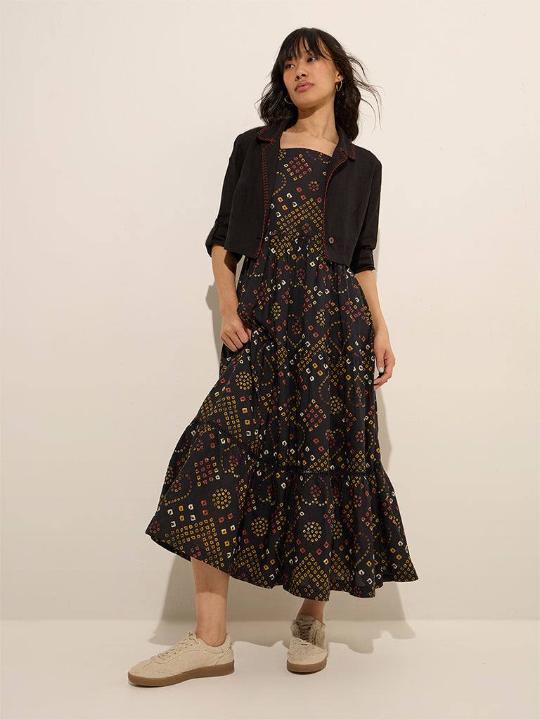 Bombay Paisley Black Bandhani Printed Tiered Dress with Jacket