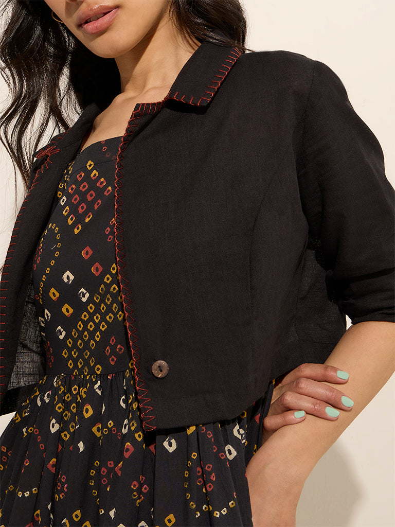 Bombay Paisley presents this black dress in an ethnic-inspired bandhani print. The lightweight garment is designed with tiered detailing including a square neck. adjustable shoulder straps. sleeveless cut and a smocked back. Comes along a jacket featuring intricate embroidery. Its notched collar. single button down addition and full sleeves complete this item.