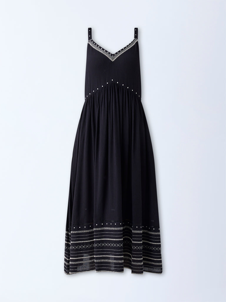 Effortlessly capturing the spirit of modern femininity. this black embroidered dress from Bombay Paisley offers a perfect balance of comfort and charm. The soft plunge neckline and fit-and-flare silhouette create an easy. flattering drape. while the concealed back zip ensures a seamless finish.