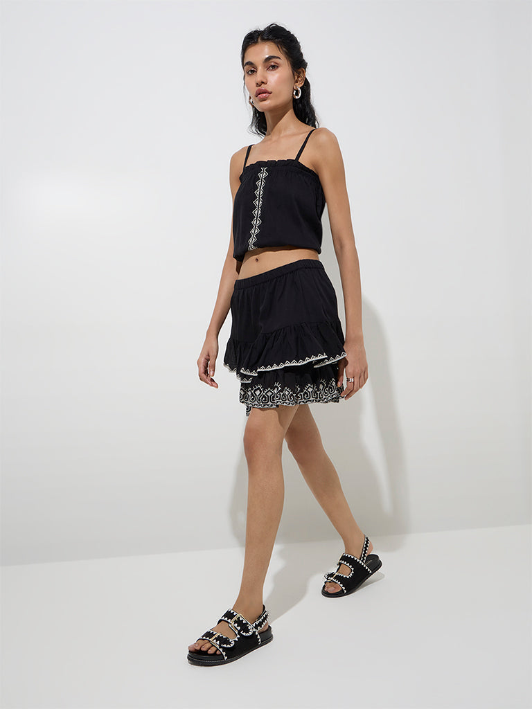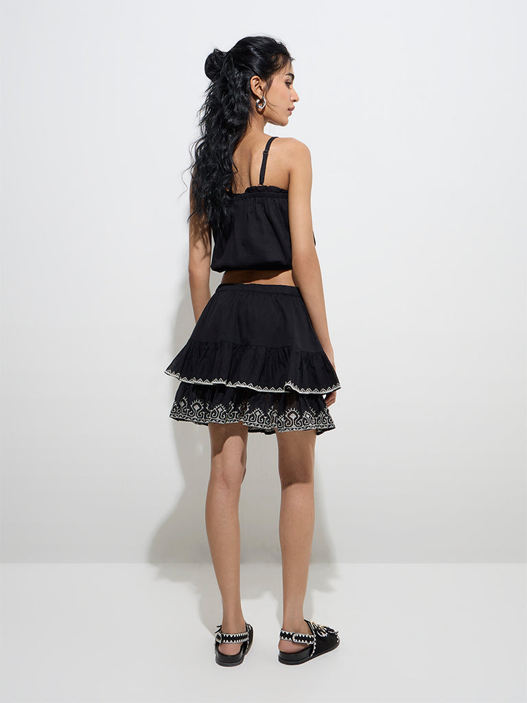 Bombay Paisley presents this black mini skirt. crafted with a ruffled tiered structure for a chic appeal. Adorned with contrasting embroidery. it is made from soft. breathable fabric. The high-rise design features a smooth elastic waistband for a comfortable fit.