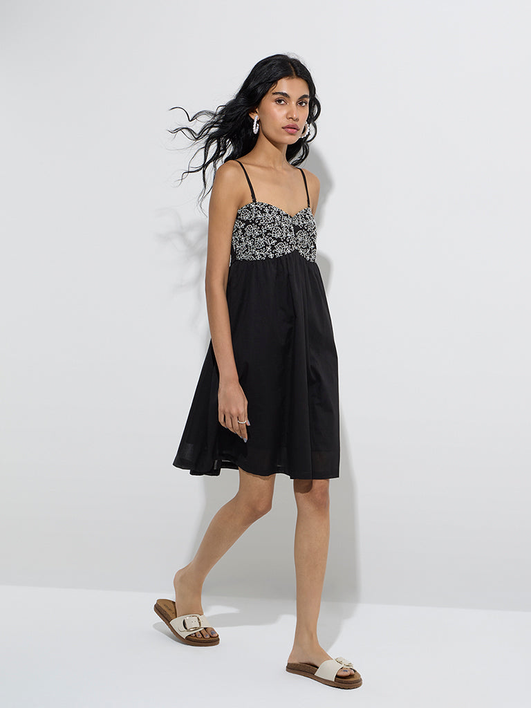 This black dress from Bombay Paisley showcases dainty floral embroidery on the bodice for a touch of feminine charm. Milled from pure cotton for ultimate comfort. it features a sweetheart neckline and adjustable shoulder straps. while the smocked back ensures a flattering fit.