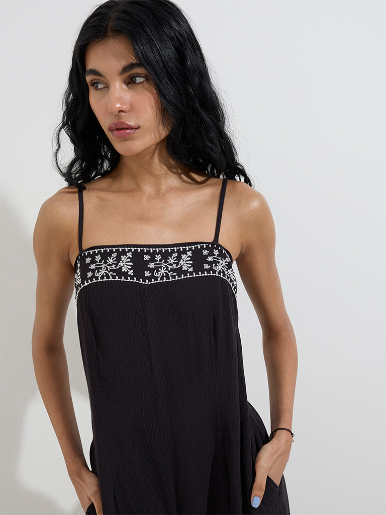 This black jumpsuit from Bombay Paisley is adorned with delicate floral embroidery. Milled from a lightweight fabric. it features a square neckline. adjustable straps. and a side zipper for a secure fit.