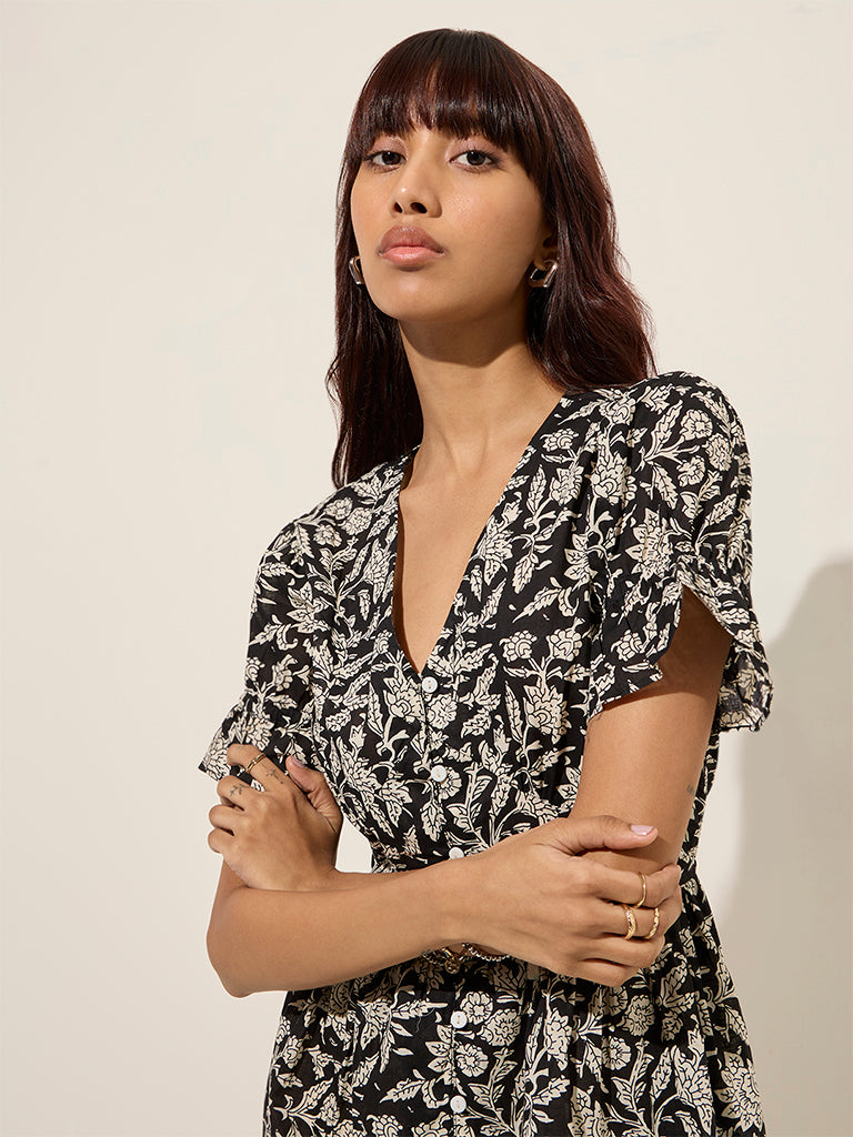 Cut in an A-line silhouette. this black dress from Bombay Paisley showcases floral prints. Its lightweight build ensures easy comfort. while the V-neck. button placket. and short sleeves complete it