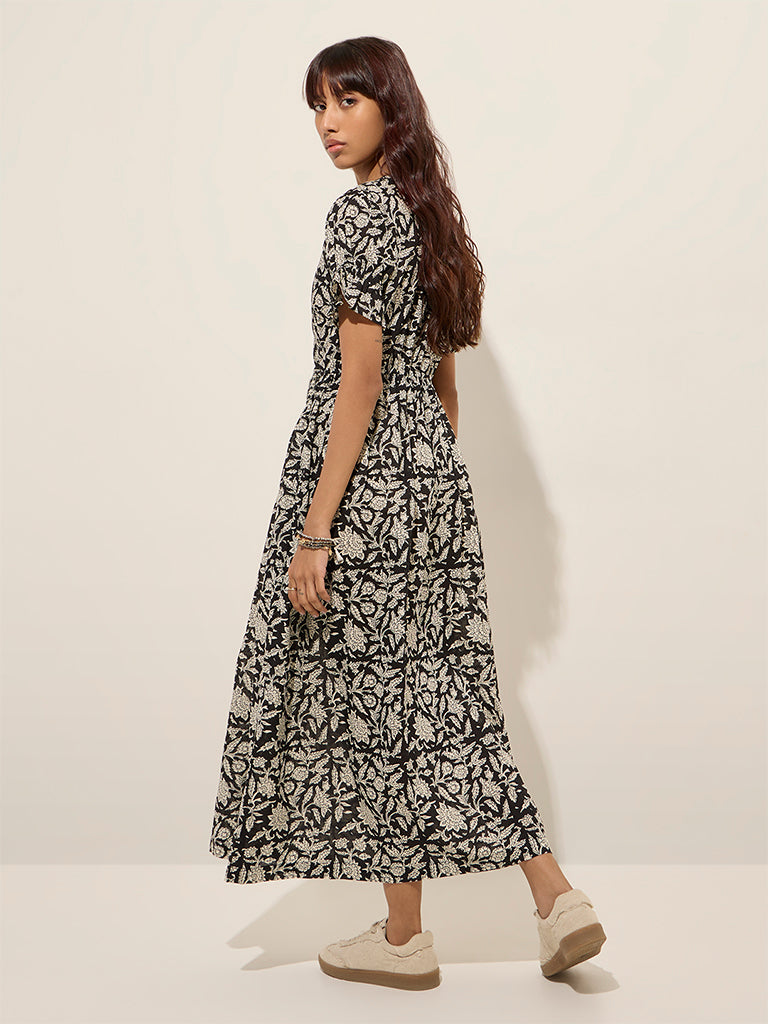 Bombay Paisley Black Floral Printed Cotton A-Line Dress