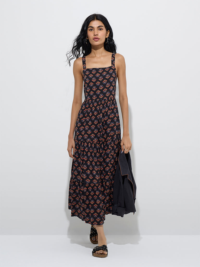 This black dress from Bombay Paisley is carved in a tiered silhouette and adorned with floral motifs for a graceful touch. Featuring a square neck and adjustable shoulder straps. it offers a flattering fit. The look is elevated with a matching cropped jacket. adding a layer of versatility and charm.