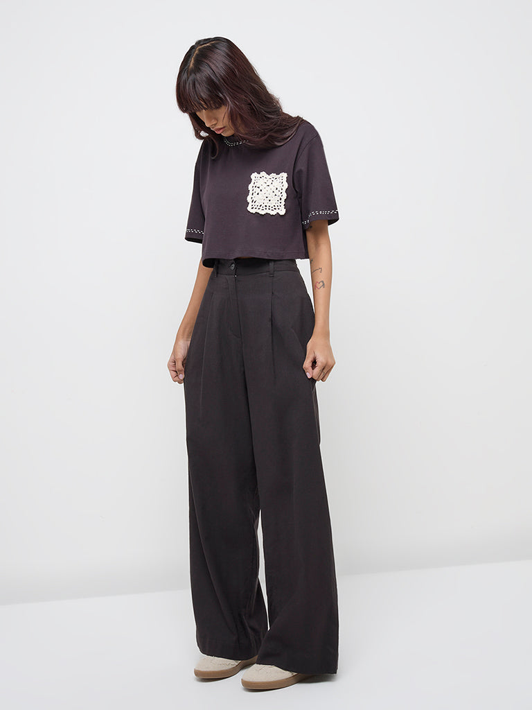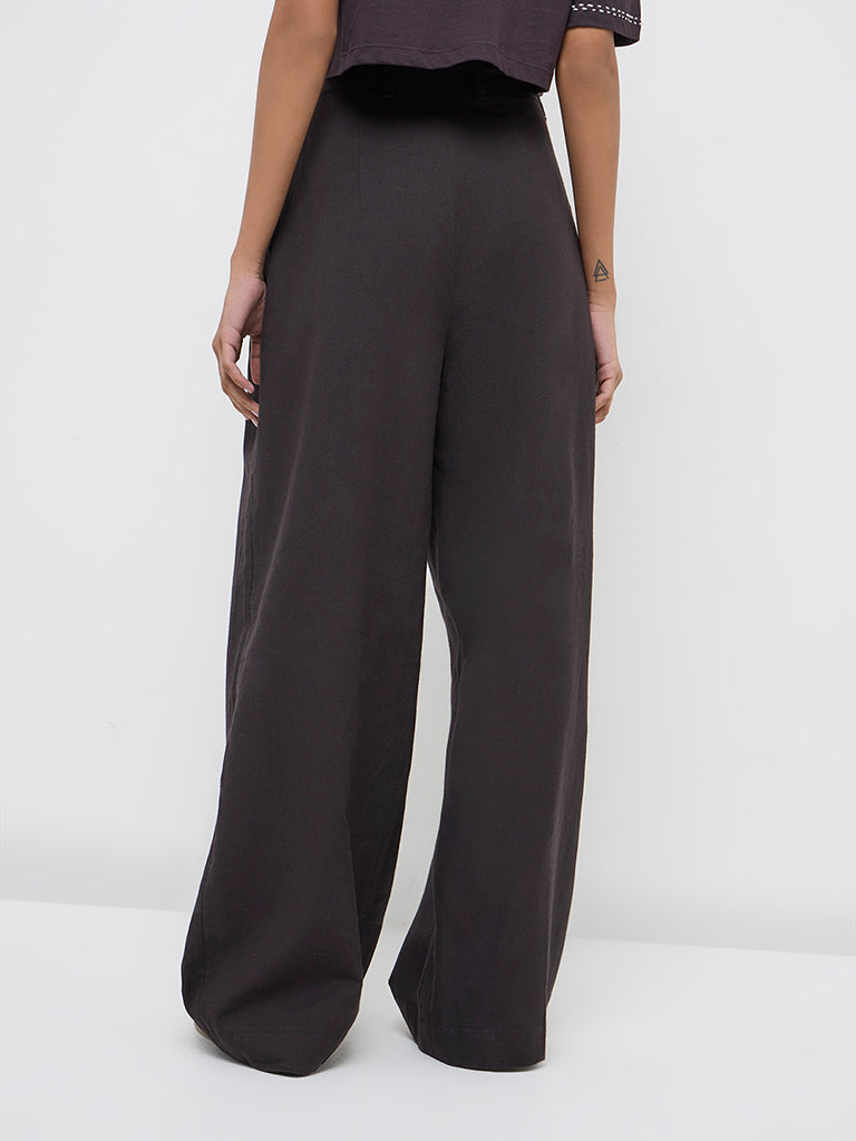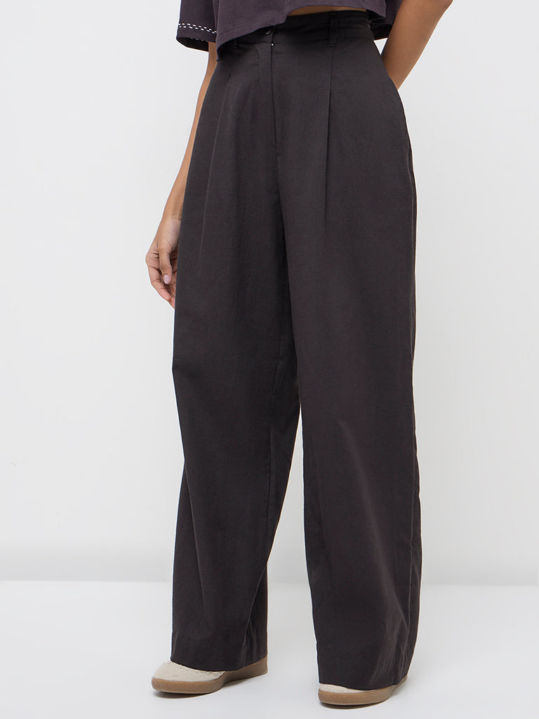 These black pants by Bombay Paisley offer a high-rise fit. Crafted in a cotton-rich blend. the high-rise bottom wear carries a buttoned waistband. belt loops. zipper fly and side pockets.