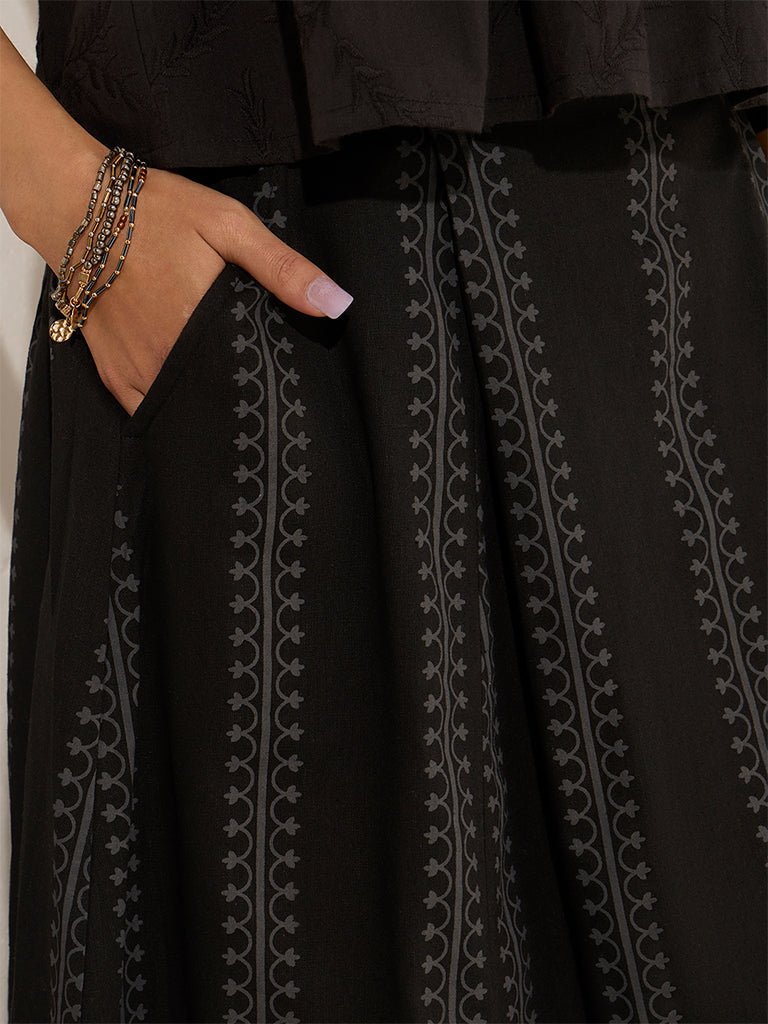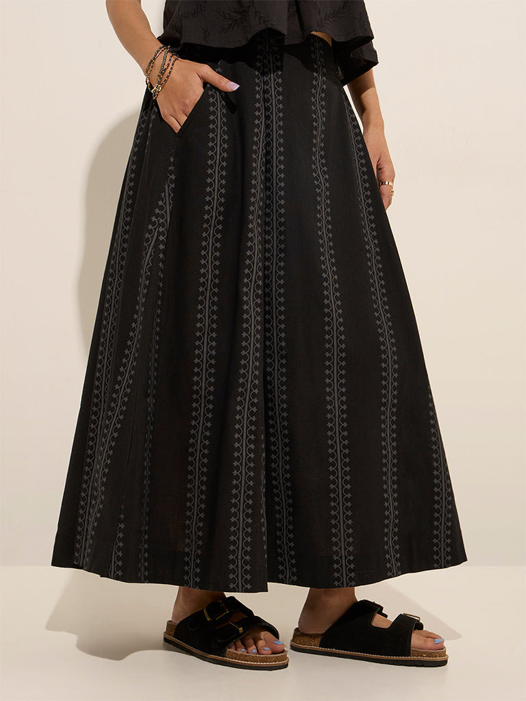 Bombay Paisley launches this black skirt fashioned with printed detailing and pleated design. The soft and lightweight fabric garment is carved in an elegant A-line silhouette. It carries a smooth elastic waistband and side pockets for stylish high-rise fit.