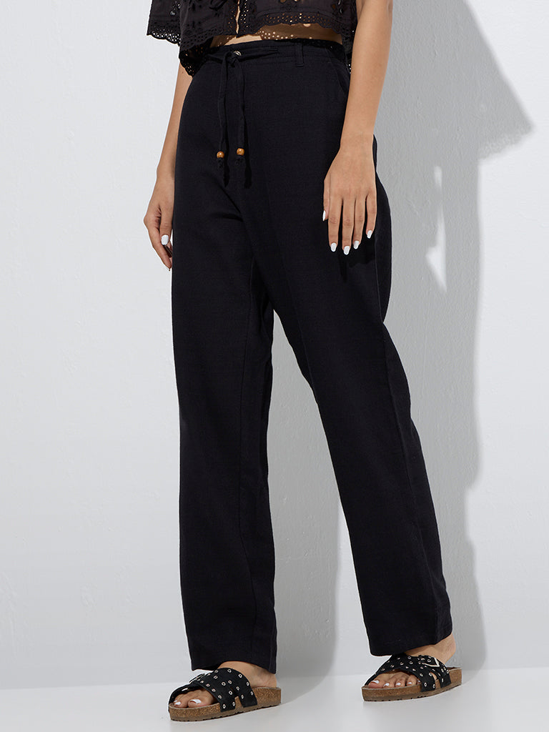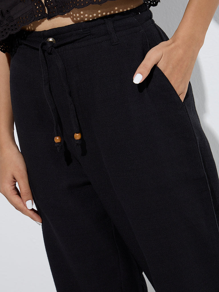 These black pants from Bombay Paisley are spun from a rich cotton-blend fabric for a soft yet structured feel. Featuring a buttoned waistband. zipper fly. and functional belt loops. they’re finished with adjustable drawstrings accented with beads—merging everyday ease with subtle detailing.