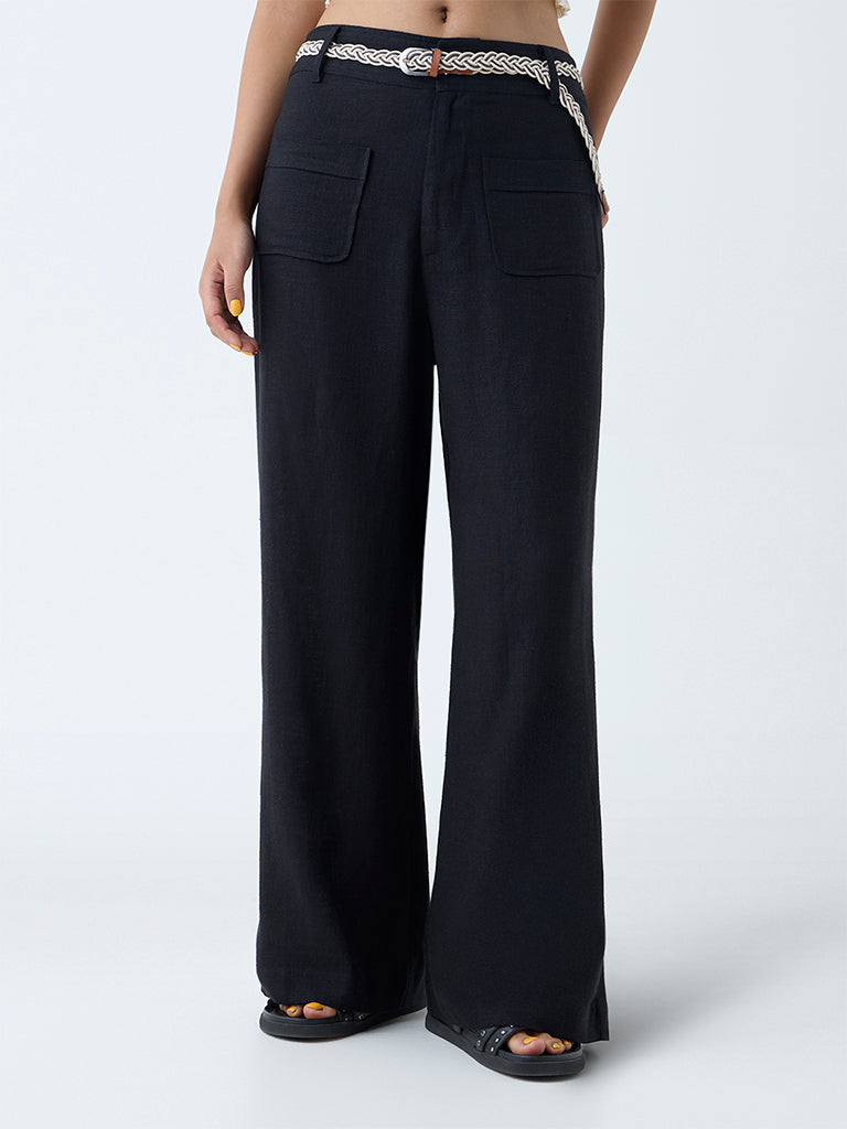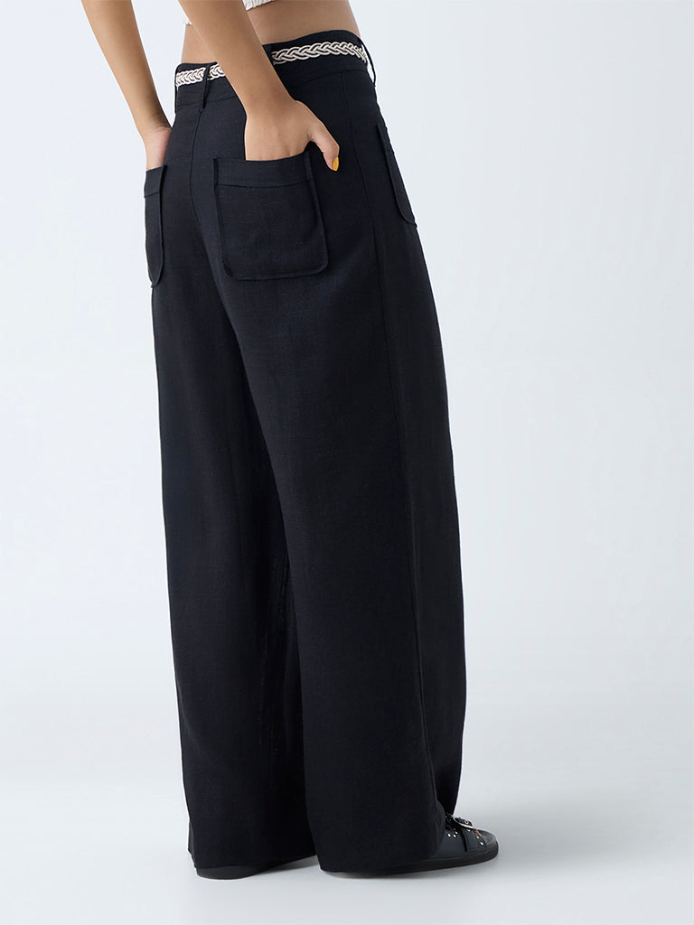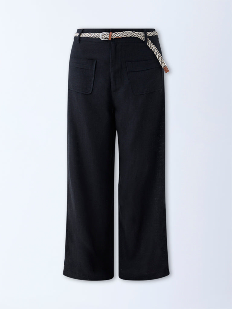 These black pants from Bombay Paisley are tailored from a sumptuous linen-blend fabric that balances structure with breathability. Designed with a buttoned waistband. belt loops. and a detachable belt. they allow for a customised fit. Multiple pockets and a zipper fly add a utilitarian edge. while the flared silhouette enhances ease of movement.