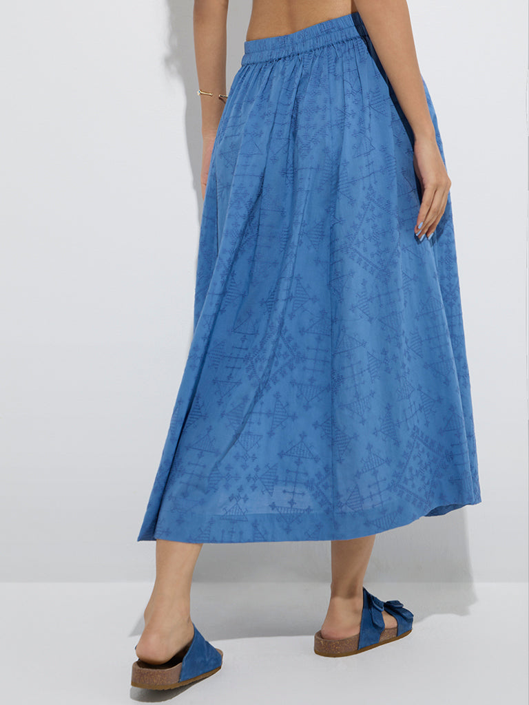 This blue midi skirt from Bombay Paisley showcases intricate tribal-inspired embroidery that adds a touch of artisanal charm. Milled from pure cotton for ultimate comfort. it features an elasticated waistband that ensures a secure fit. Thoughtfully finished with functional side pockets. this piece blends everyday ease with distinctive style.