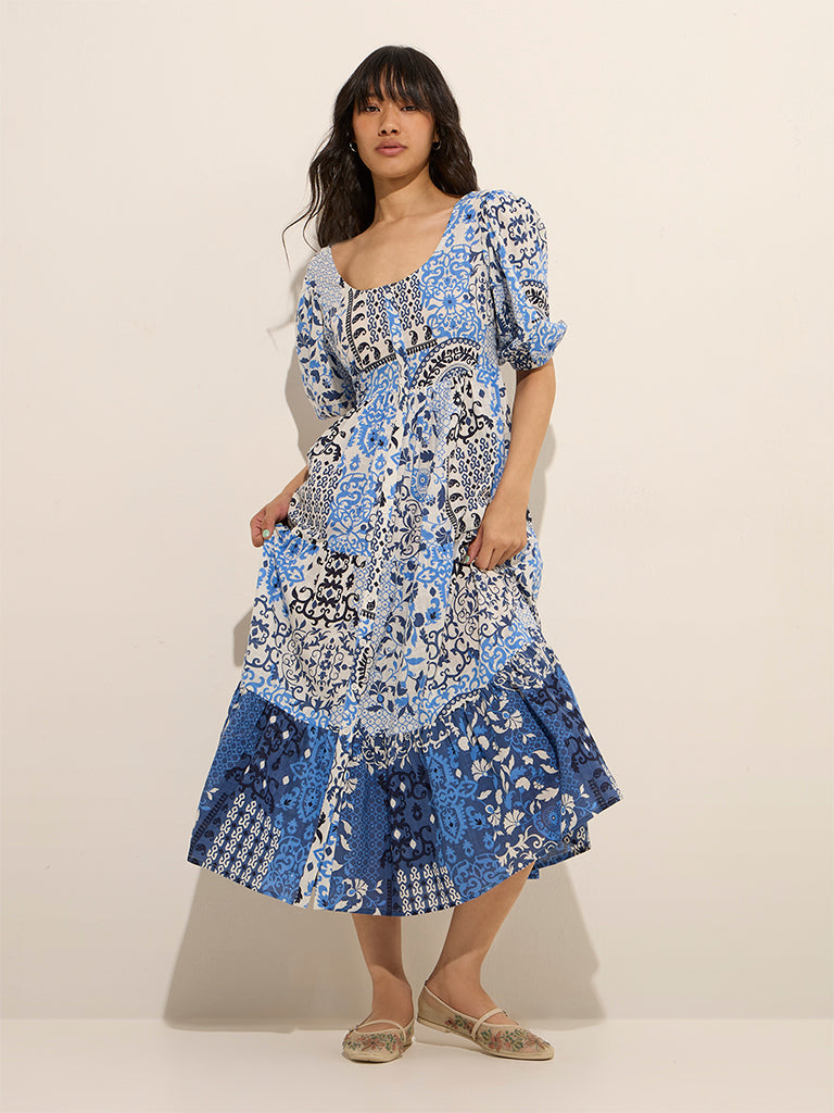 This blue dress adorned with ethnic prints is launched from Bombay Paisley. Made from a lightweight fabric. this scoop-neck separate comes finished with short puffed sleeves. Style it with white sandals for a finished look.