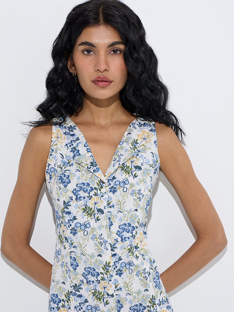 This blue dress from Bombay Paisley is decked with floral prints on pure cotton fabric. Cut in a straight silhouette. it features a notched collar. a button-up front. and a sleeveless cut for effortless summer styling.