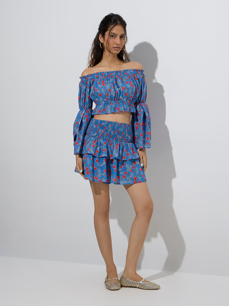 This blue top from Bombay Paisley is adorned with vibrant floral prints for a refreshing summer look. Crafted from pure cotton for all-day comfort. it features an off-shoulder neckline and smocked bell sleeves for a touch of flair. The ruffle detailing at the waist adds a playful finish. making it a charming choice for sun-soaked outings.