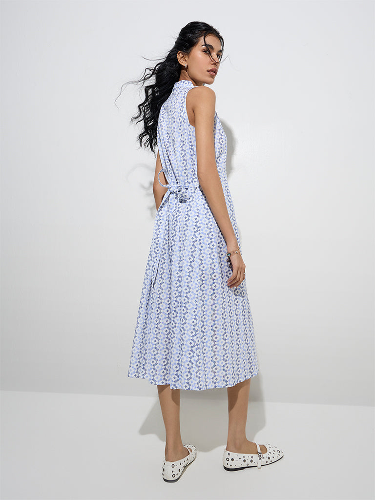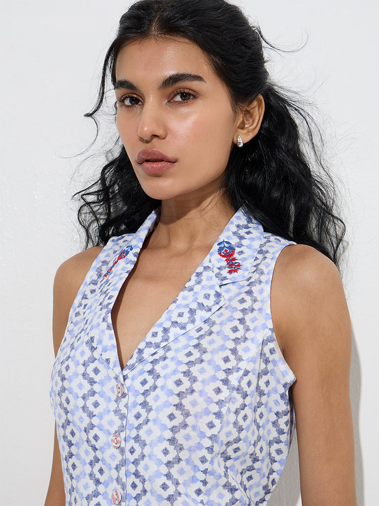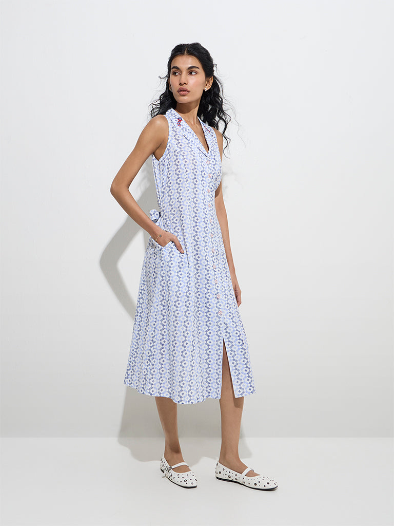 Graceful florals and elegant details come together in this blue shirt dress from Bombay Paisley. Crafted from pure cotton. it features delicate floral prints. a notched collar with embroidered accents. and a button-down front. The sleeveless design is complemented by a stylish knot detail at the back. adding a chic touch.