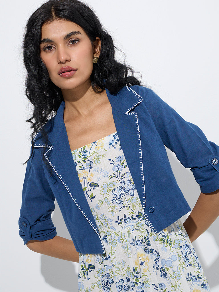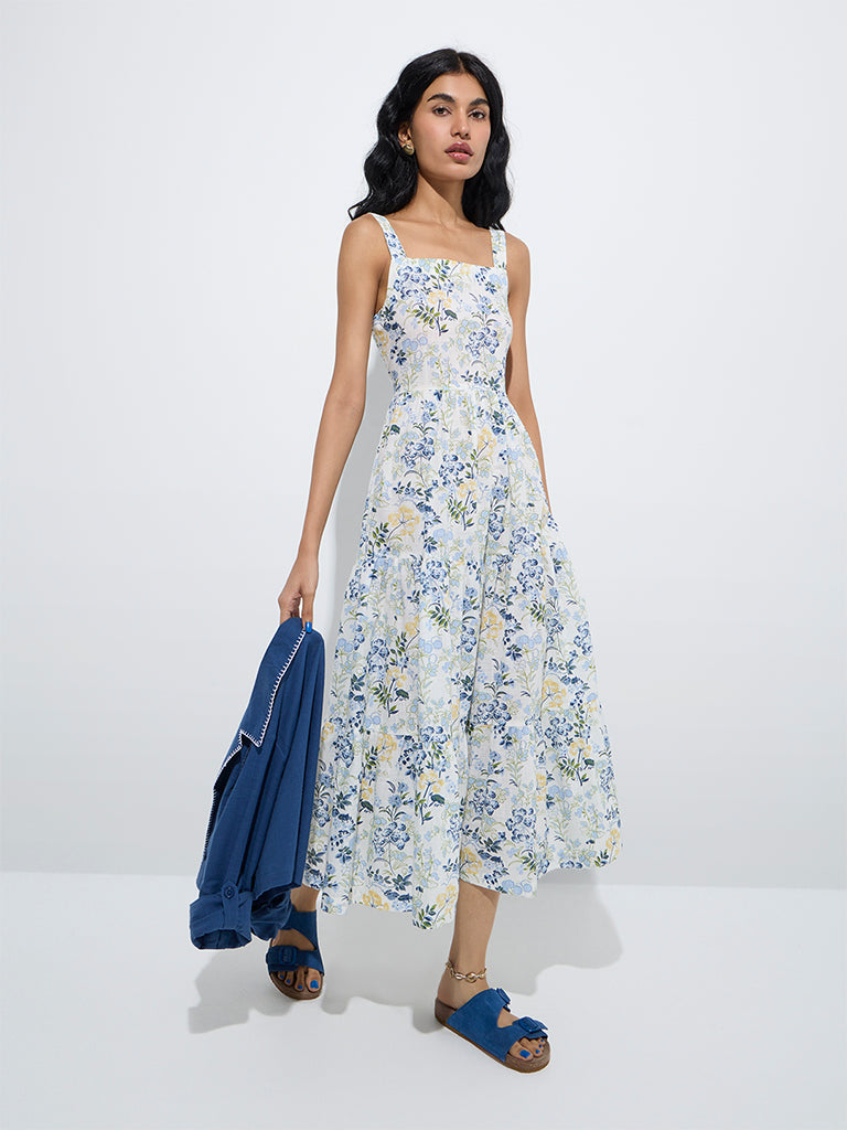 Bombay Paisley presents this blue floral-printed dress crafted from pure cotton. designed in a tiered silhouette. Featuring a square neck. adjustable straps. and a smocked back. this dress offers both comfort and style. Layered with a coordinating jacket detailed with a notched lapel collar and full sleeves. this ensemble is perfect for daytime gatherings and summer outings.