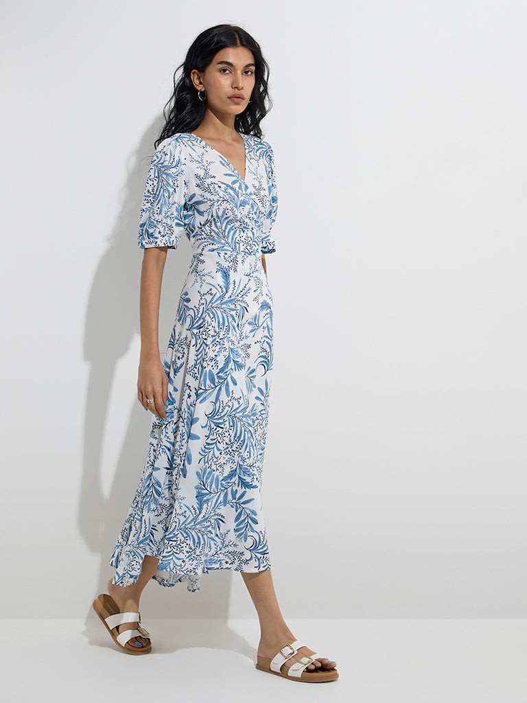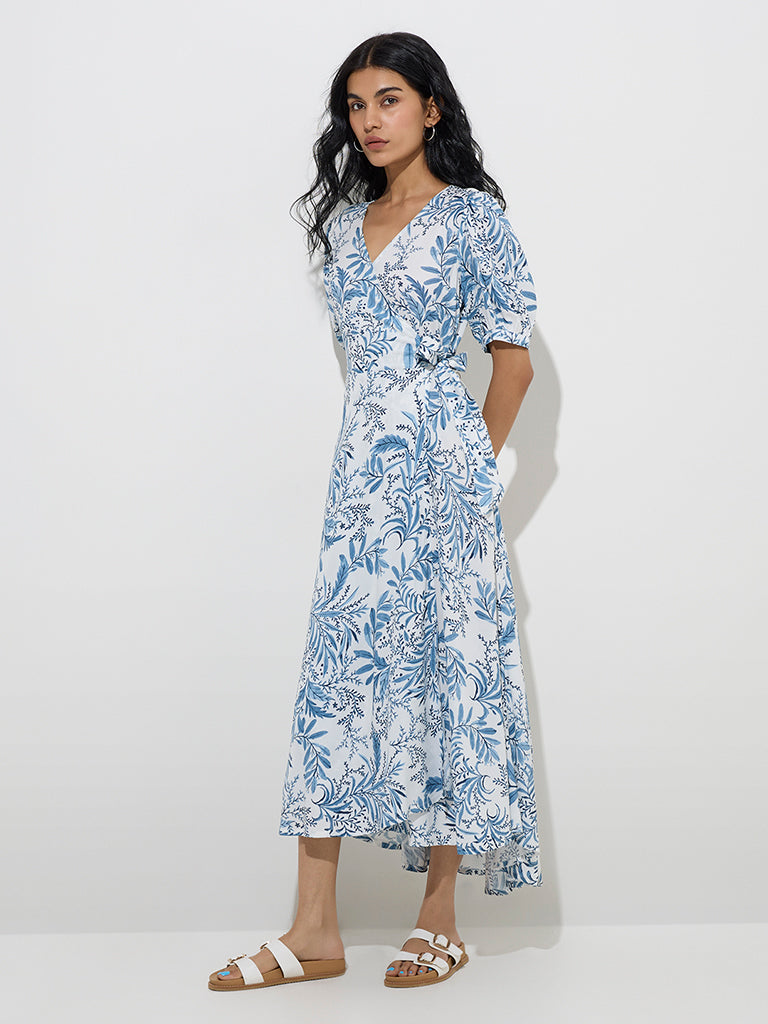 Bombay Paisley Blue Foliage Design Wrap-Style Dress