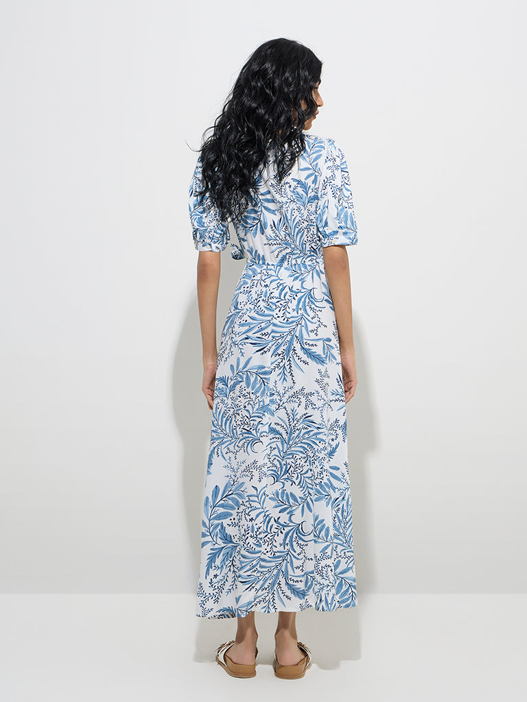 This blue dress from Bombay Paisley showcases foliage-inspired motifs that lend a nature-chic charm. Sculpted in a flattering A-line silhouette. it features a V-neck that flows into a wrap-style bodice. complemented by voluminous puff sleeves. Made from a lightweight fabric. it offers breezy comfort and effortless style.