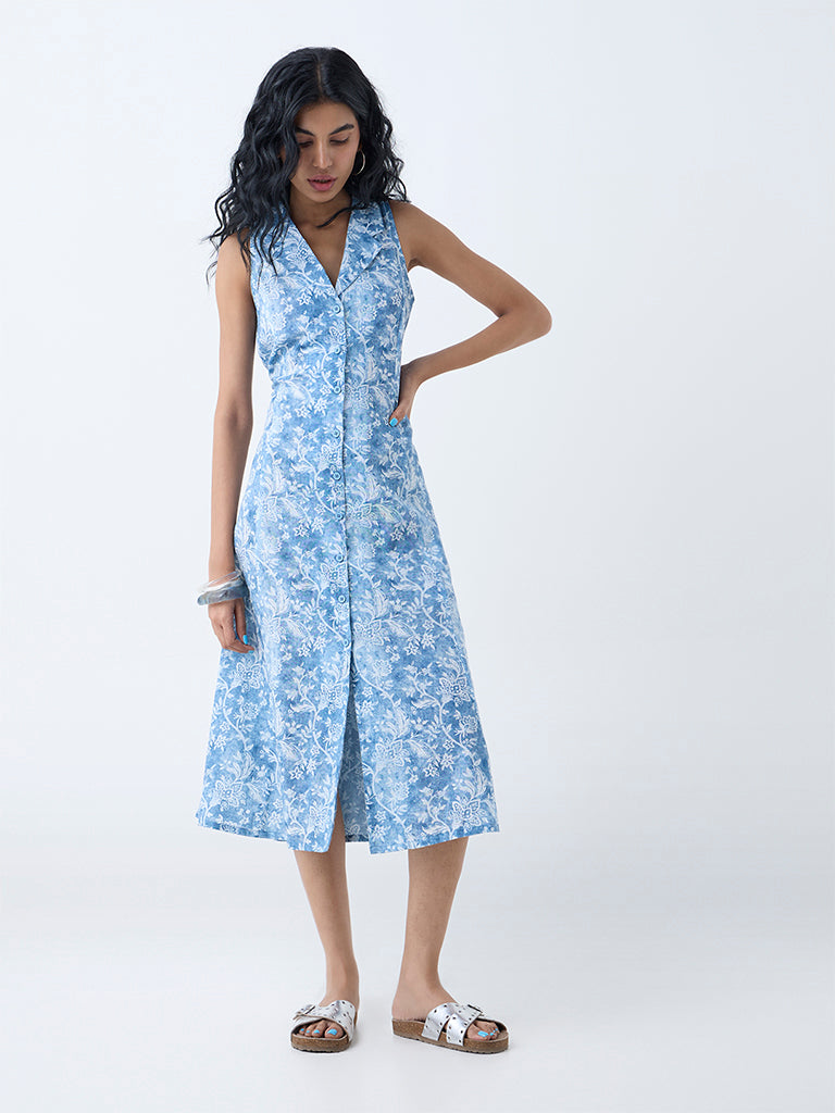 Bombay Paisley Blue Foliage Pattern Cotton Shirt Dress