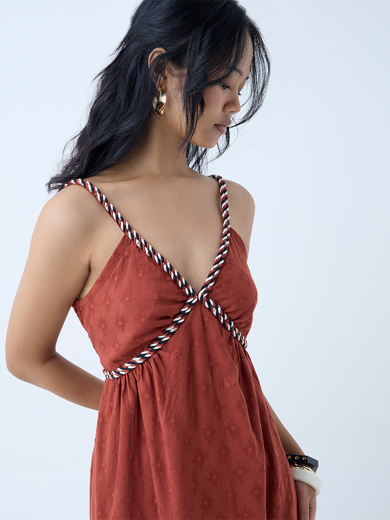 This brown dress from Bombay Paisley blends earthy elegance with artisanal detail. Constructed from a cotton-rich fabric in a breezy A-line silhouette. it features tonal embroidery that lends depth without overpowering the look. The plunge neckline is framed with interwoven cord accents and slim straps. offering a handcrafted edge to its refined design.