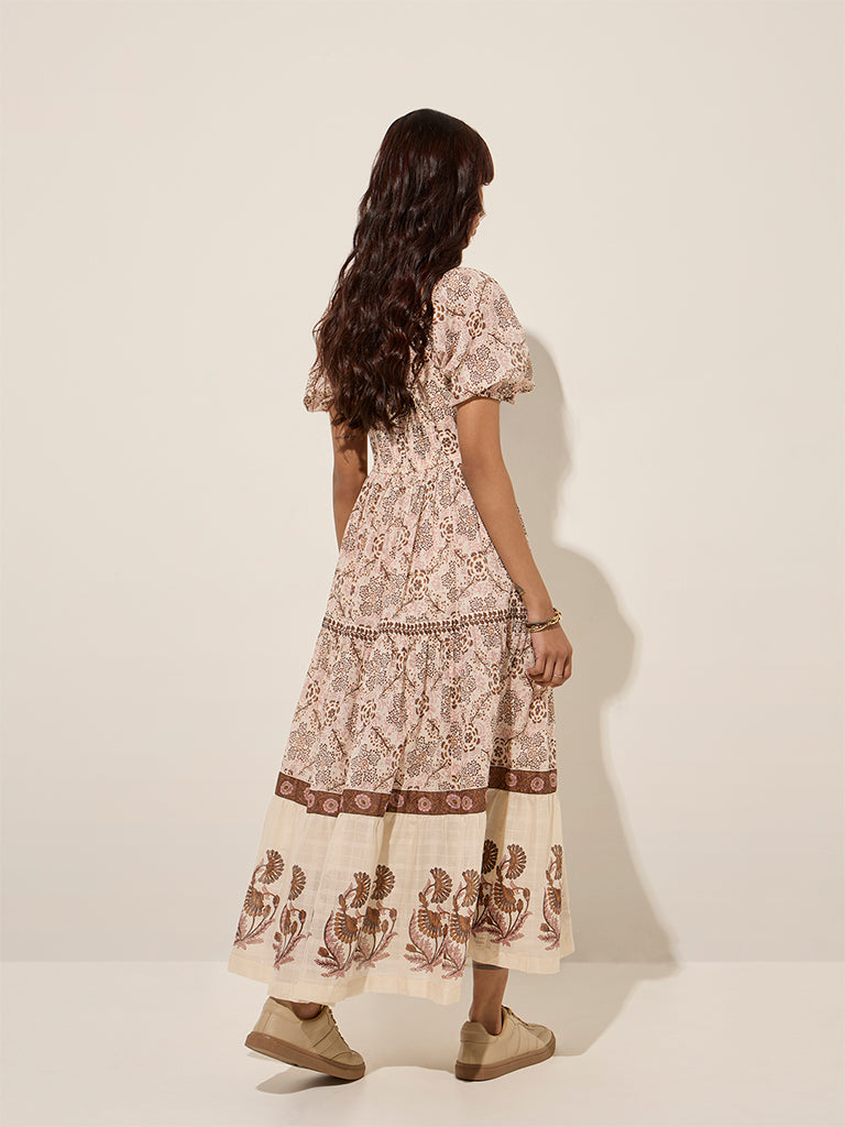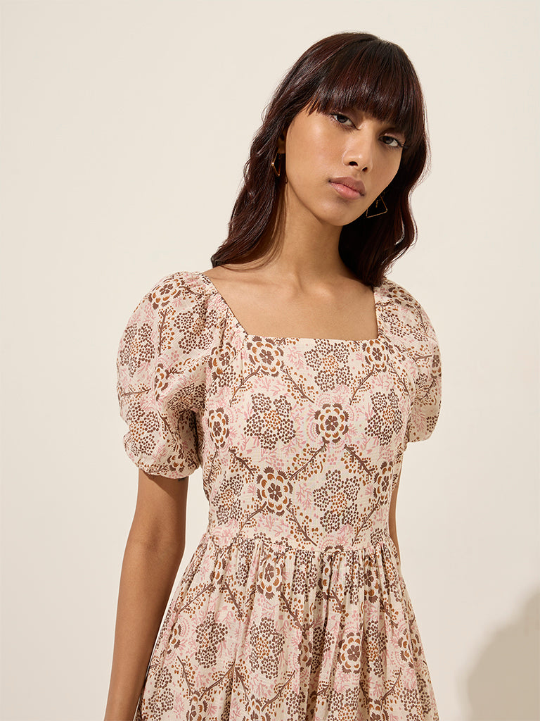 This brown dress from Bombay Paisley flaunts floral prints throughout. Crafted from a lightweight fabric. the full-length creation is fitted with a square neck and puff sleeves.