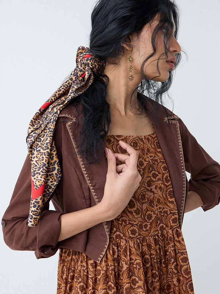 Amplify your off-duty style with this brown dress from Bombay Paisley. Printed with delicate florals. it’s designed with a square neck and adjustable straps. while the tiered silhouette lends it a breezy flow. Finished with a cropped jacket. the set creates a coordinated look that balances comfort and contemporary appeal.