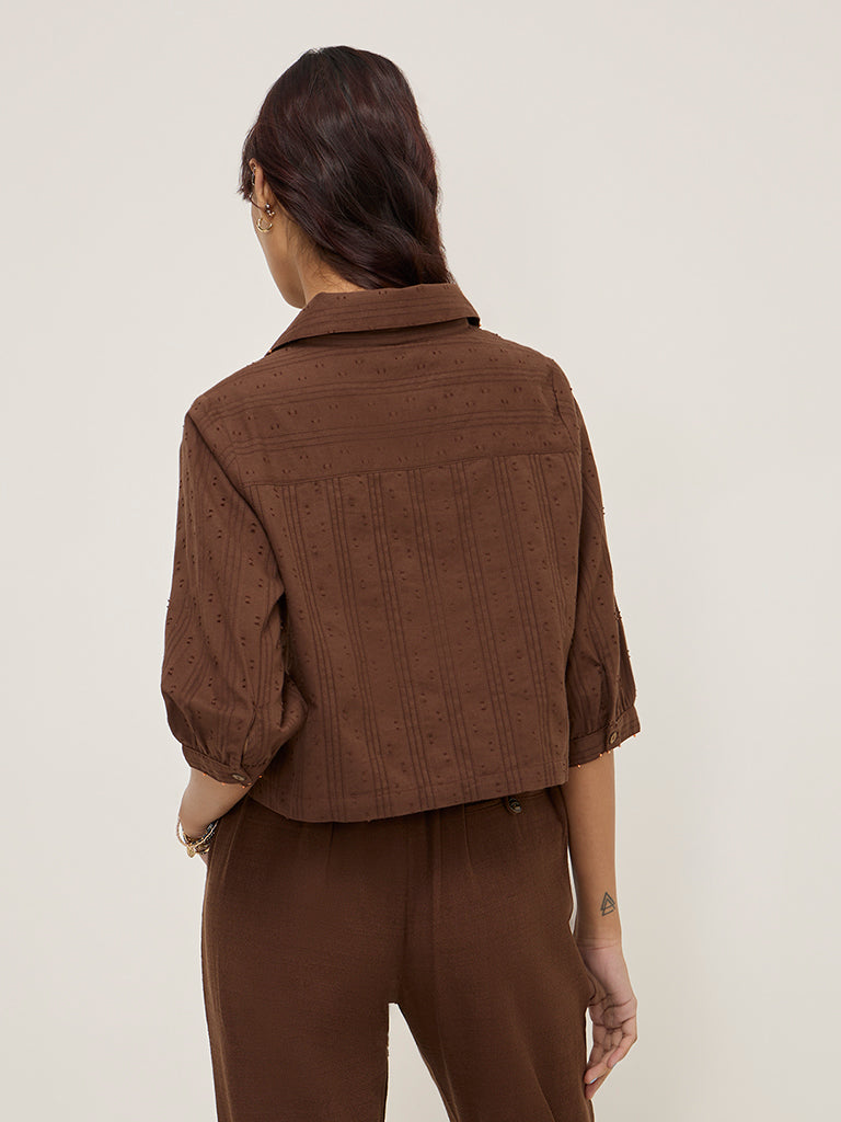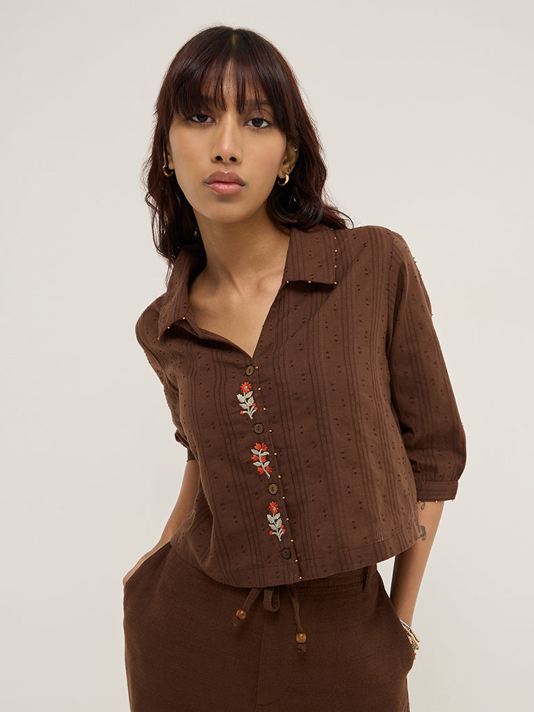 Bombay Paisley brings you this brown top boasts floral embroidery and self stripes. The pure cotton shirt features captivating Swiss dot prints. It carries a shirt collar. button down front and three-fourth sleeves.