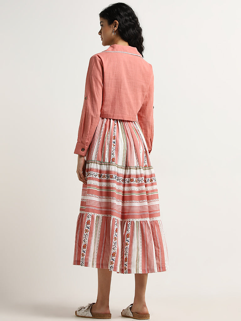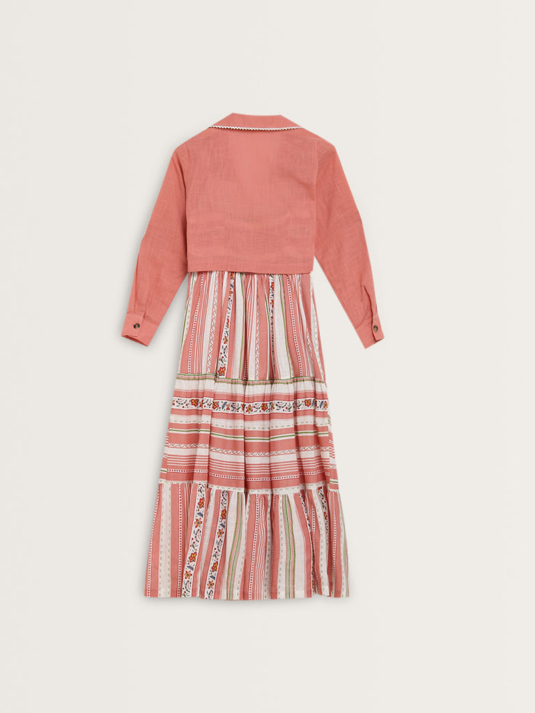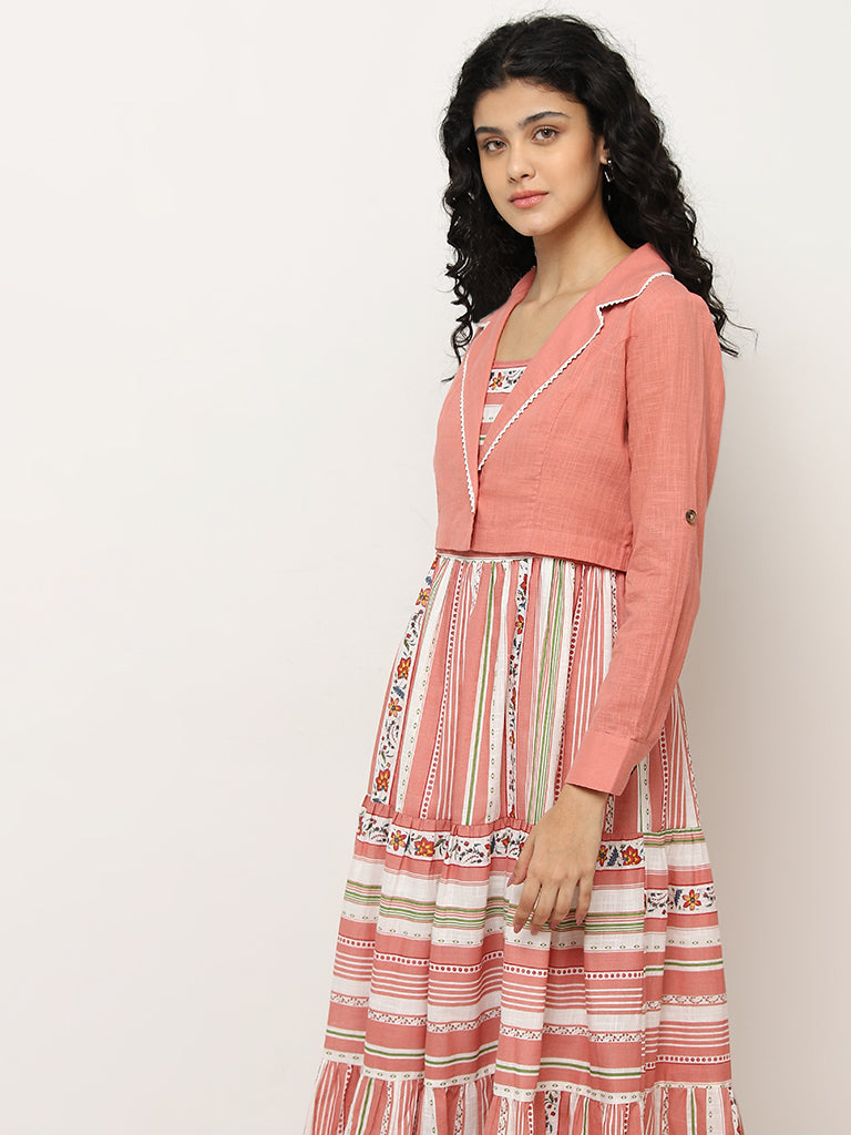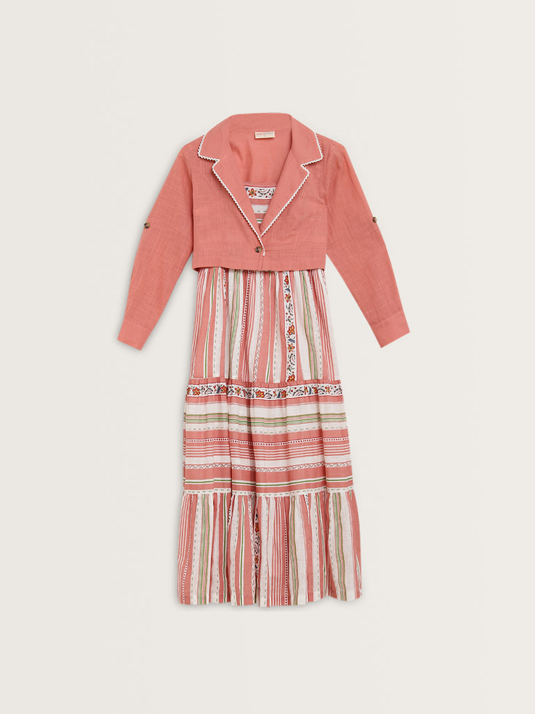 This coral dress from Bombay Paisley blends striped prints with floral designs. Crafted from breathable fabric in a tiered silhouette. it comes with a jacket featuring a notched lapel and full sleeves. The jacket includes a secure button closure at the front and stylish crochet trims.