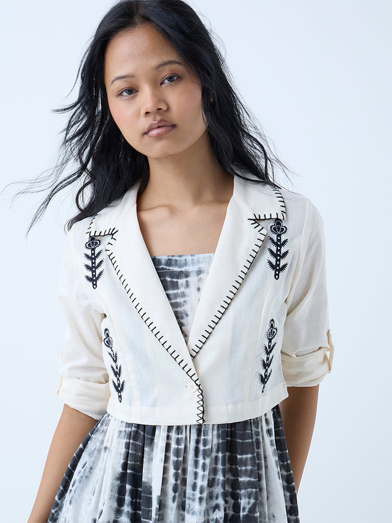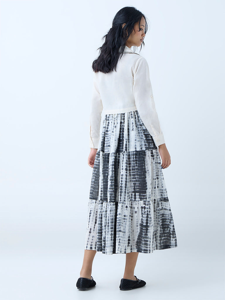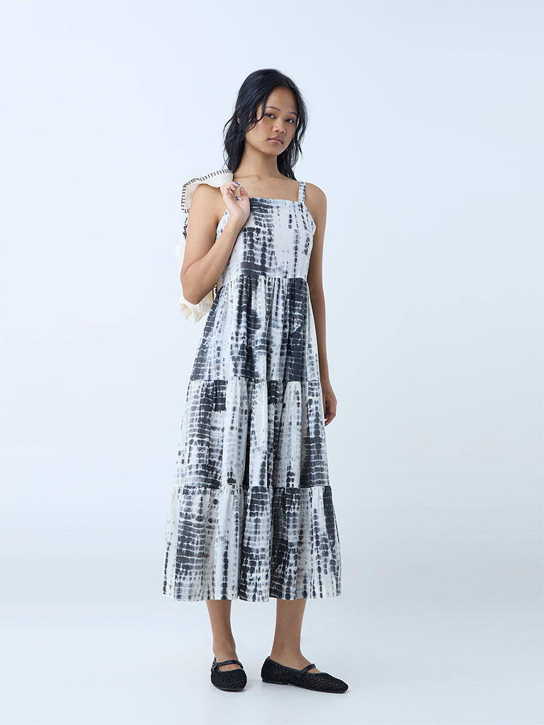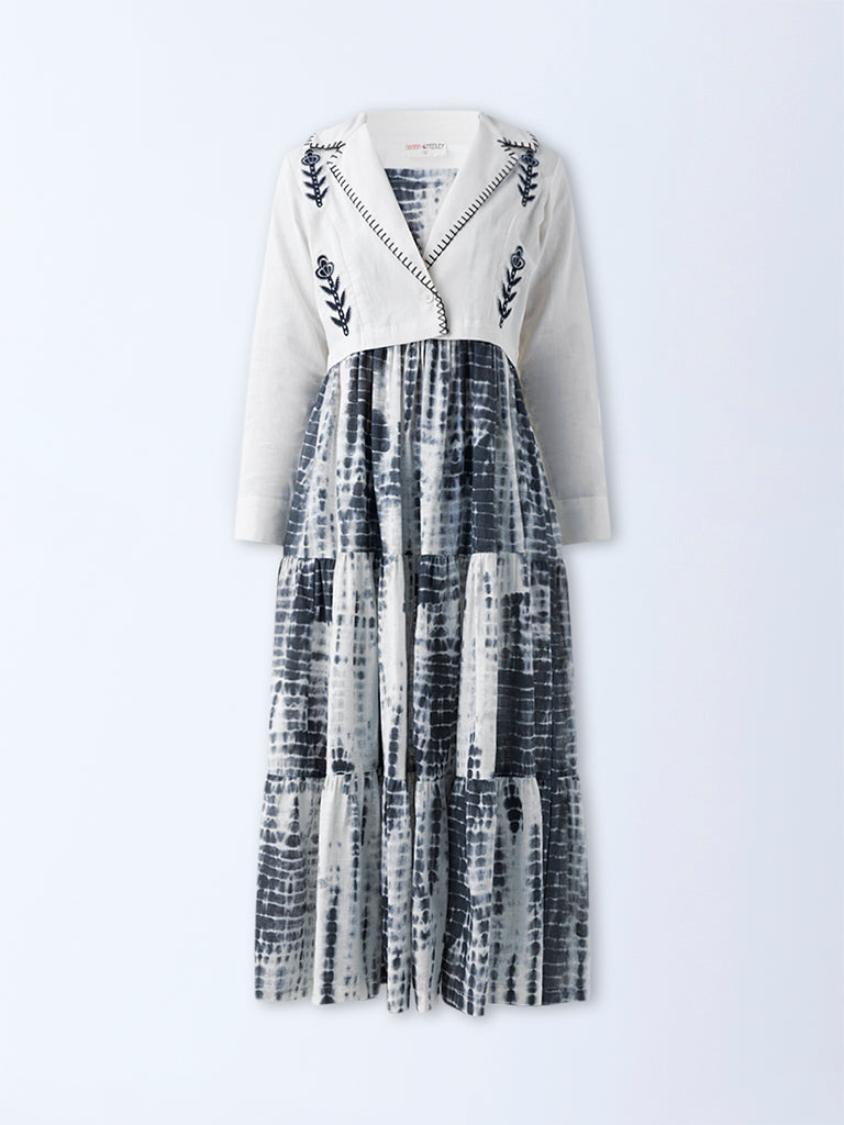 Bombay Paisley introduces this dark grey dress. reimagined in a tie-dye profile for a striking yet grounded aesthetic. Milled from pure cotton in a flowy tiered silhouette. it features a square neck with adjustable straps and a smocked back for ease and movement. The set is elevated with a matching jacket. adorned with floral embroidery. a notched lapel. and full sleeves.